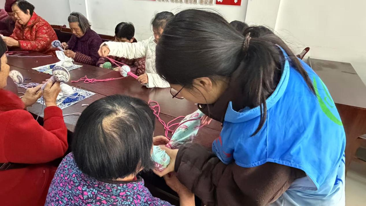上午10点,活动室提前完成适老化布置,社工首先带领大家做手部拉伸操暖场,老人们在轻松互动中逐渐放松下来。活动以春季健康知识问答拉开序幕,社工用抢答方式普及流感预防知识,并介绍艾草锤祛湿驱寒的功效。随后进入手工制作环节,社工采用“慢动作示范+分步讲解”的方式,指导老人制作艾草养生锤。针对动手能力较弱的老人,社工与志愿者“一对一”协助,鼓励老人发挥创意、自主搭配。现场互助氛围浓厚,视力不佳的老人在邻座帮助下穿绳扎结,几位手巧的阿姨主动当起“临时老师”,自发形成的互助行为超过20次。在成果展示环节,82岁的独居老人李奶奶举着自己的作品笑得合不拢嘴:“好久没这么动过手了,热热闹闹的,心里也暖和。”