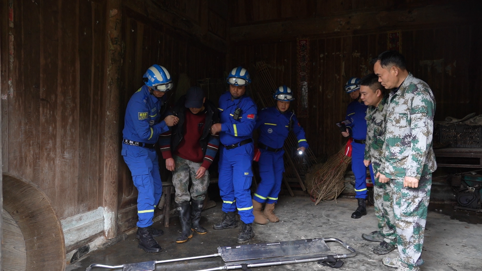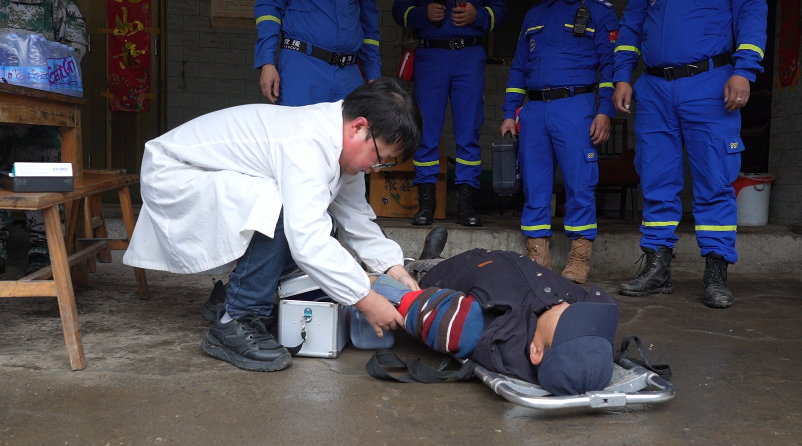 演练现场,预警信号发出后,各工作组迅速响应、联动作战。灾情监测组实时研判险情,应急抢险组第一时间敲锣预警、组织群众撤离,针对行动不便老人开展帮扶转移;治安保卫组及时划定警戒区域、维护现场秩序;医疗救护组对模拟受伤群众开展现场急救、转运救治;后勤保障组、转移安置组同步做好物资发放、群众安抚工作。各环节衔接紧密,参演人员反应迅速、操作规范,顺利完成群众转移、伤员搜救、应急安置等全流程演练。