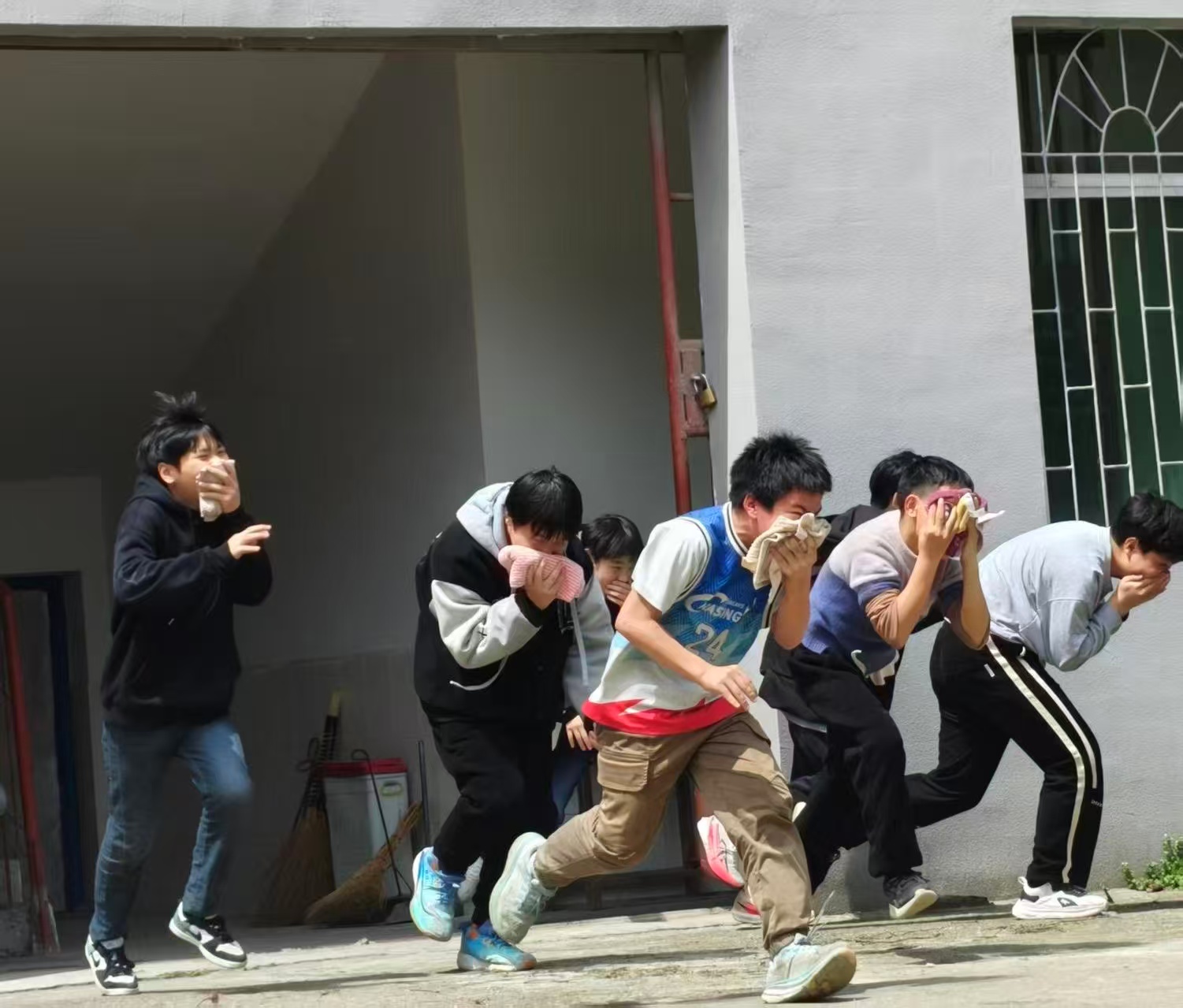 随着警报声响起,应急疏散演练正式启动。各班教师迅速组织学生,按照预定疏散路线,用湿毛巾捂住口鼻、弯腰俯身,快速有序地从宿舍撤离至操场安全区域。整个疏散过程紧张有序、衔接顺畅,学生们在规定时间内全部完成撤离。