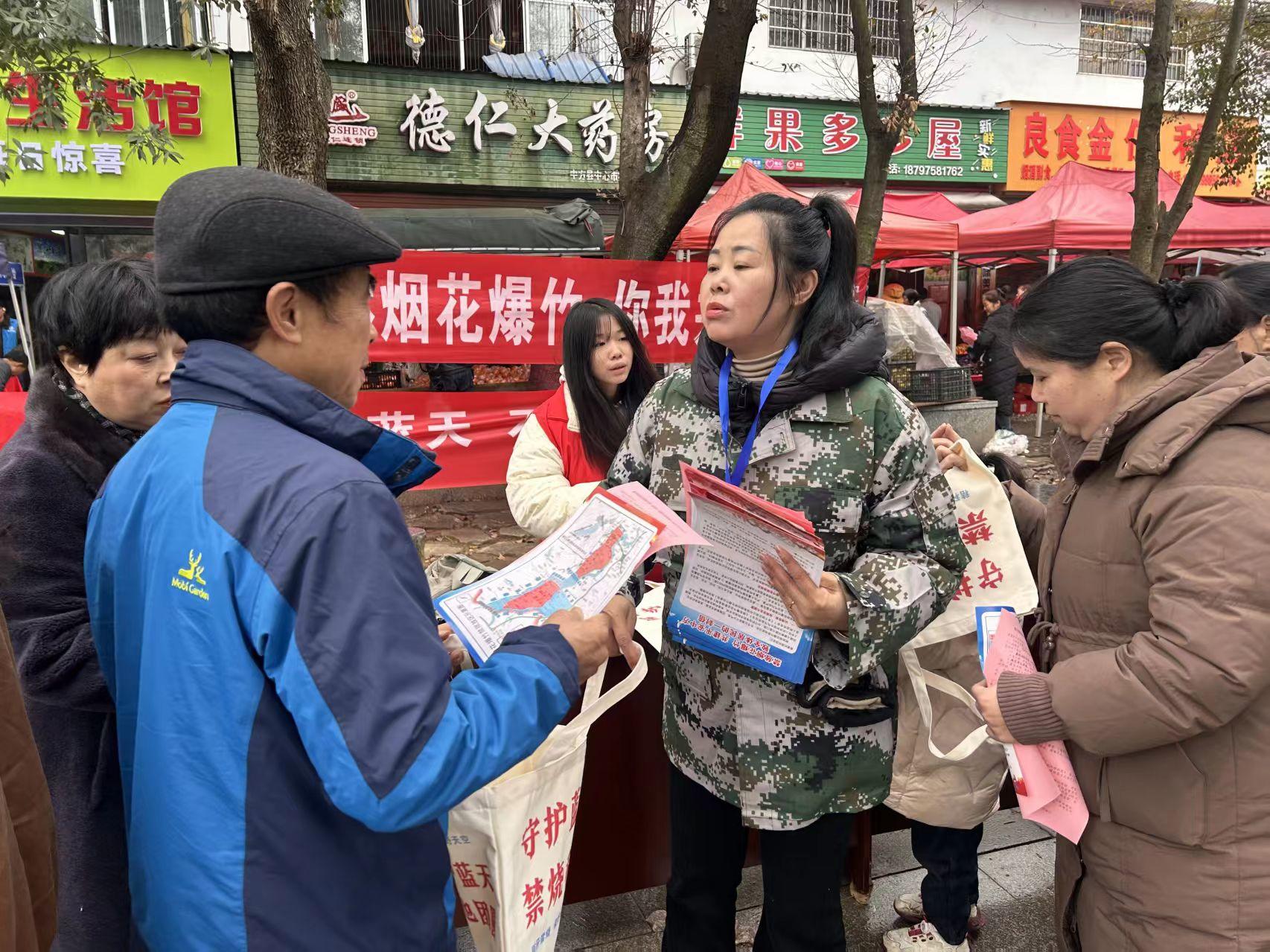 中方镇生态办以禁燃烟花爆竹为重点,用通俗易懂的方言向前来赶集的群众细致讲解禁燃限放区域及管控要求,深入解读禁燃禁放相关法律法规以及烟花爆竹燃放的安全隐患,重点说明违规燃放可能引发的火灾事故、人员伤亡及空气污染等危害,引导群众消除“过年不放炮没年味”的传统观念,绿色过节;镇护林员同步宣传森林防灭火及大气污染防治、秸秆禁(限)烧工作的重要性,说明秸秆露天焚烧的危害,提醒其易引发山火,引导合理处置,并普及野外禁火、火情处置及报警技巧。