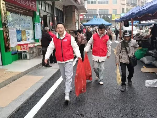 其中的3 个小组直奔集镇主要路口卡点,同步开展秩序管控,劝导沿线摆摊商贩入标线经营,严禁超道路闸口经营;规范车辆停放,向过往驾乘人员宣讲安全知识、劝导佩戴头盔,从源头消除隐患。市场内4段道路则由另外4个小组分头巡查,针对人流密集特点,逐一整顿占道经营、越线摆摊行为,协助商贩规范货物摆放。