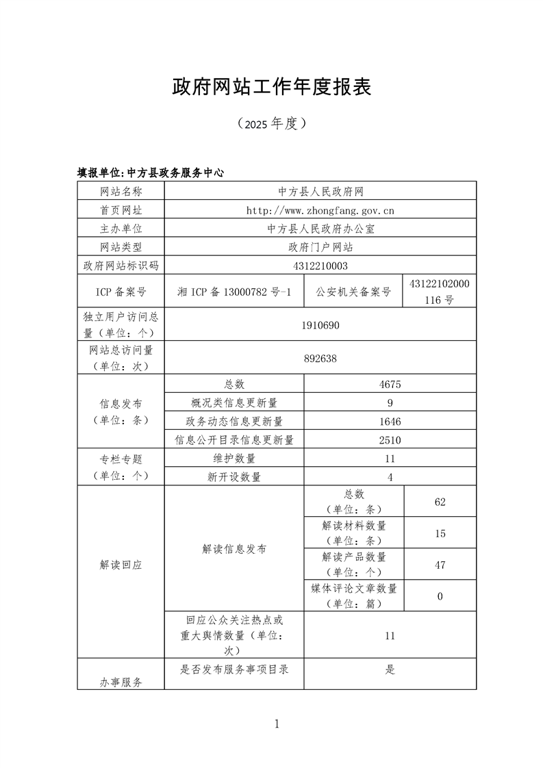 中方县人民政府2025年政府网站工作年度报表