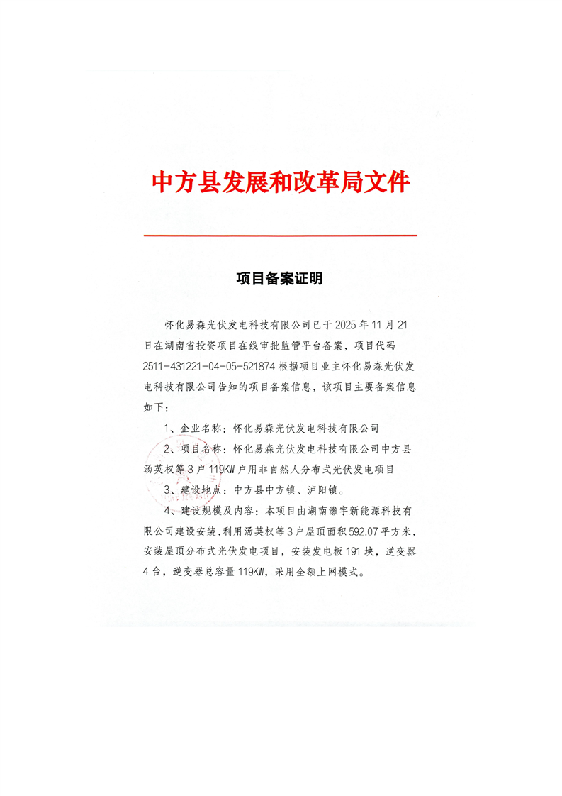怀化易森光伏发电科技有限公司中方县汤英权等3户119KW户用非自然人分布式光伏发电项目备案