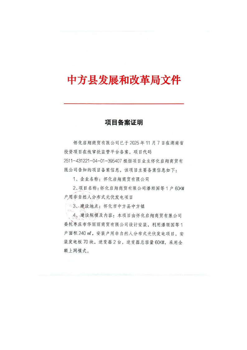 怀化启翔商贸有限公司潘顺国等1户60KW户用非自然人分布式光伏发电项目备案