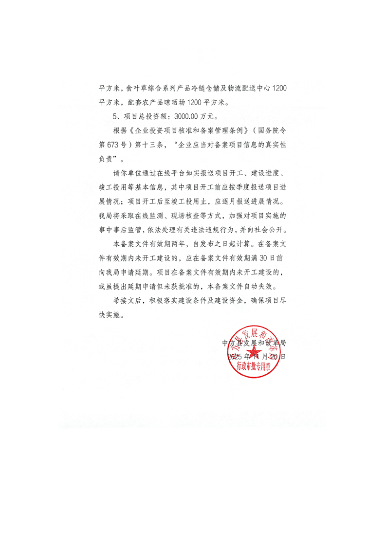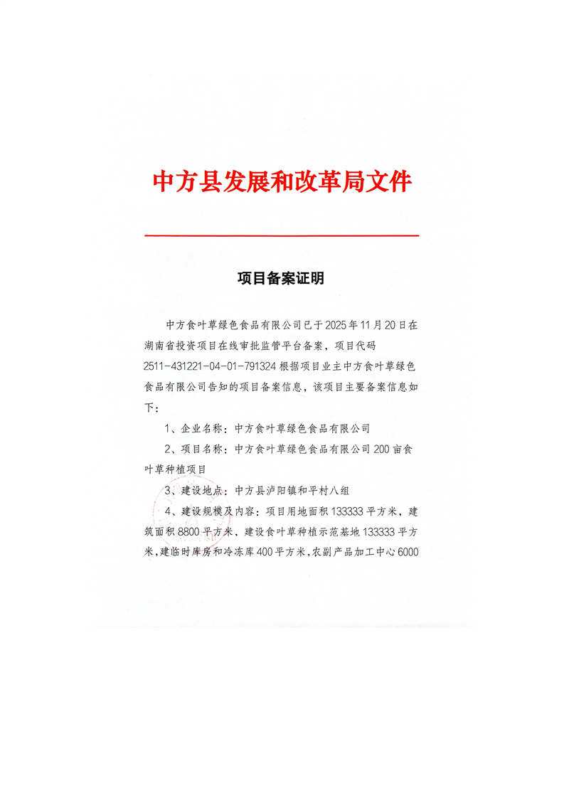 中方食叶草绿色食品有限公司200亩食叶草种植项目备案