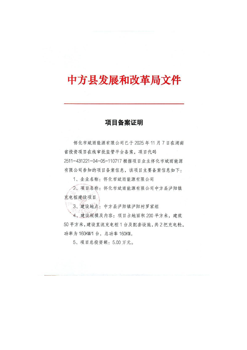 怀化市斌雨能源有限公司中方县泸阳镇充电桩建设项目备案