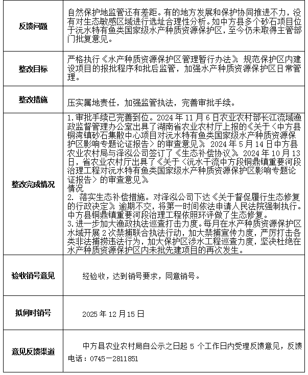 中方县农业农村局第二轮省生态环境保护督察反馈问题整改验收销号公示表