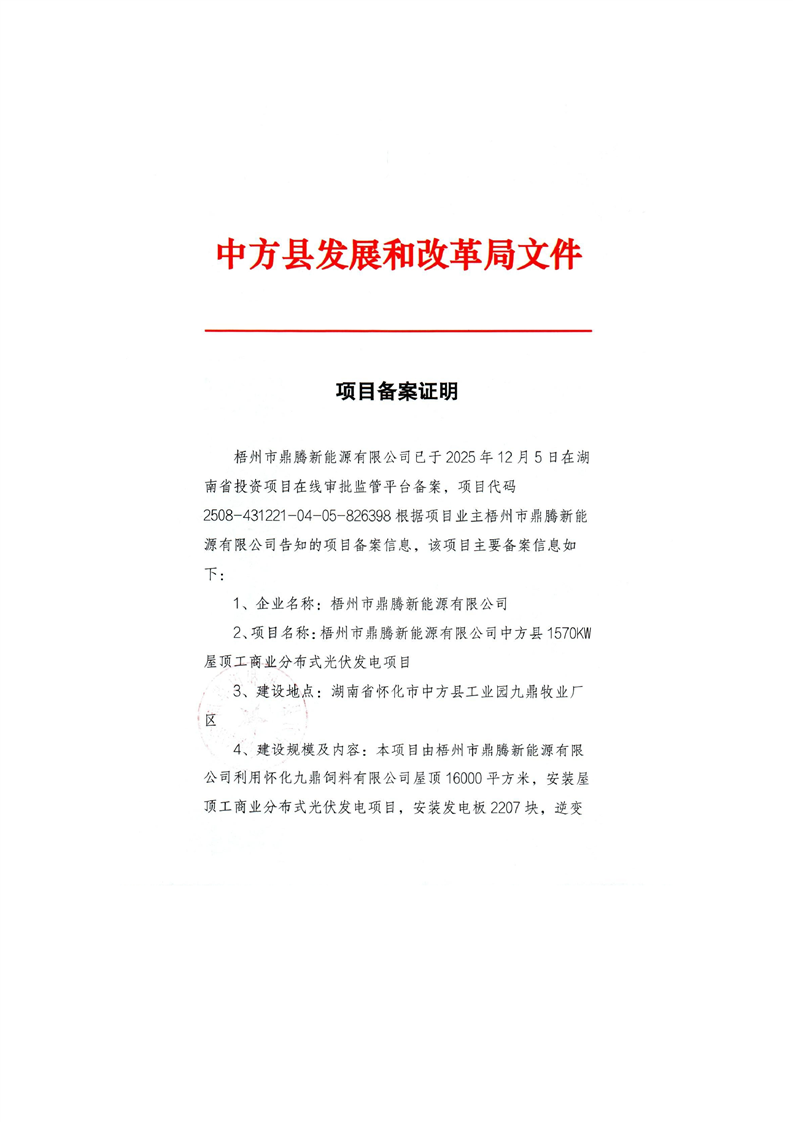 梧州市鼎腾新能源有限公司中方县1570KW屋顶工商业分布式光伏发电项目备案