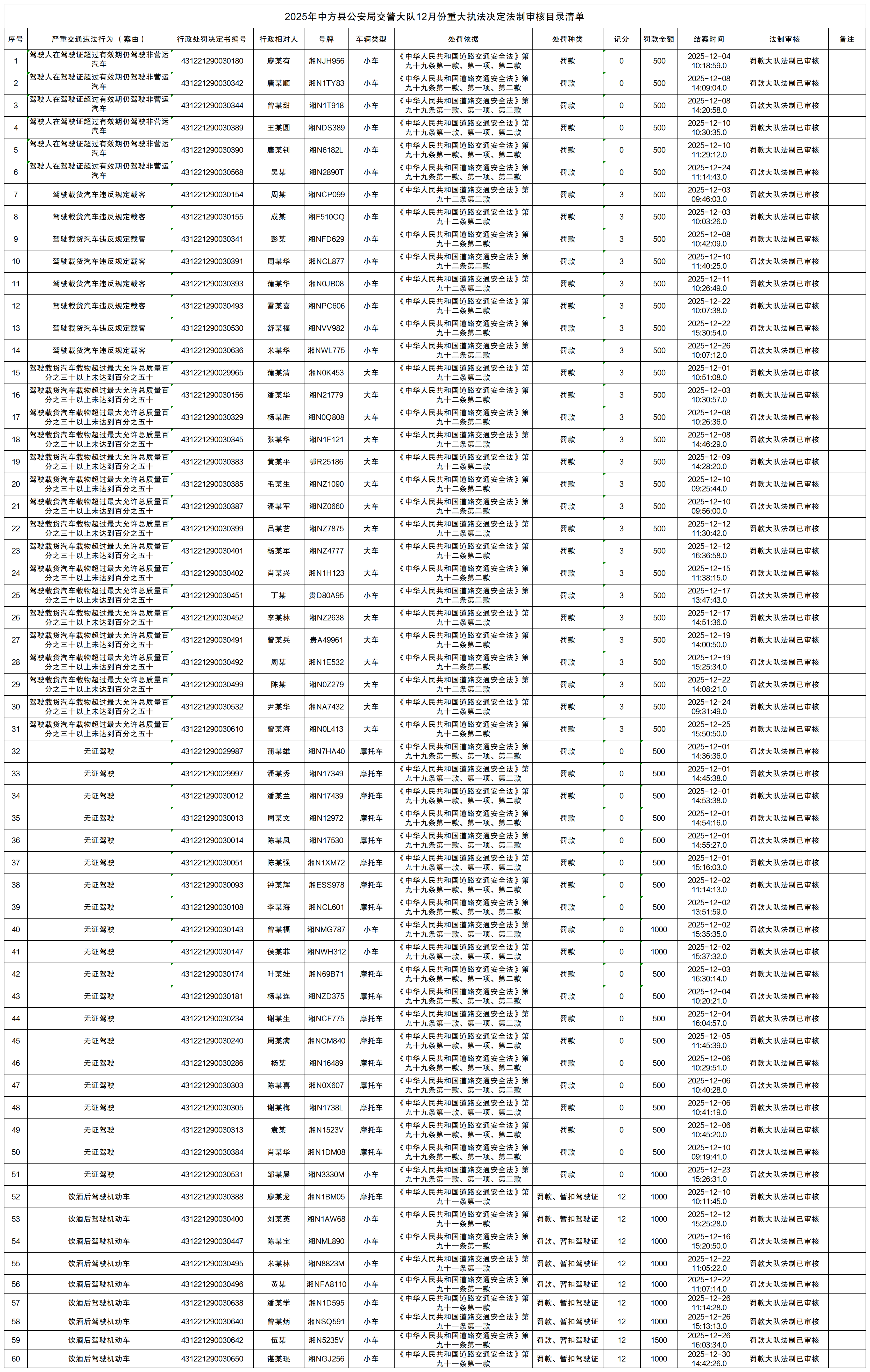 2025年中方县公安局交警大队12月份重大执法决定法制审核目录清单