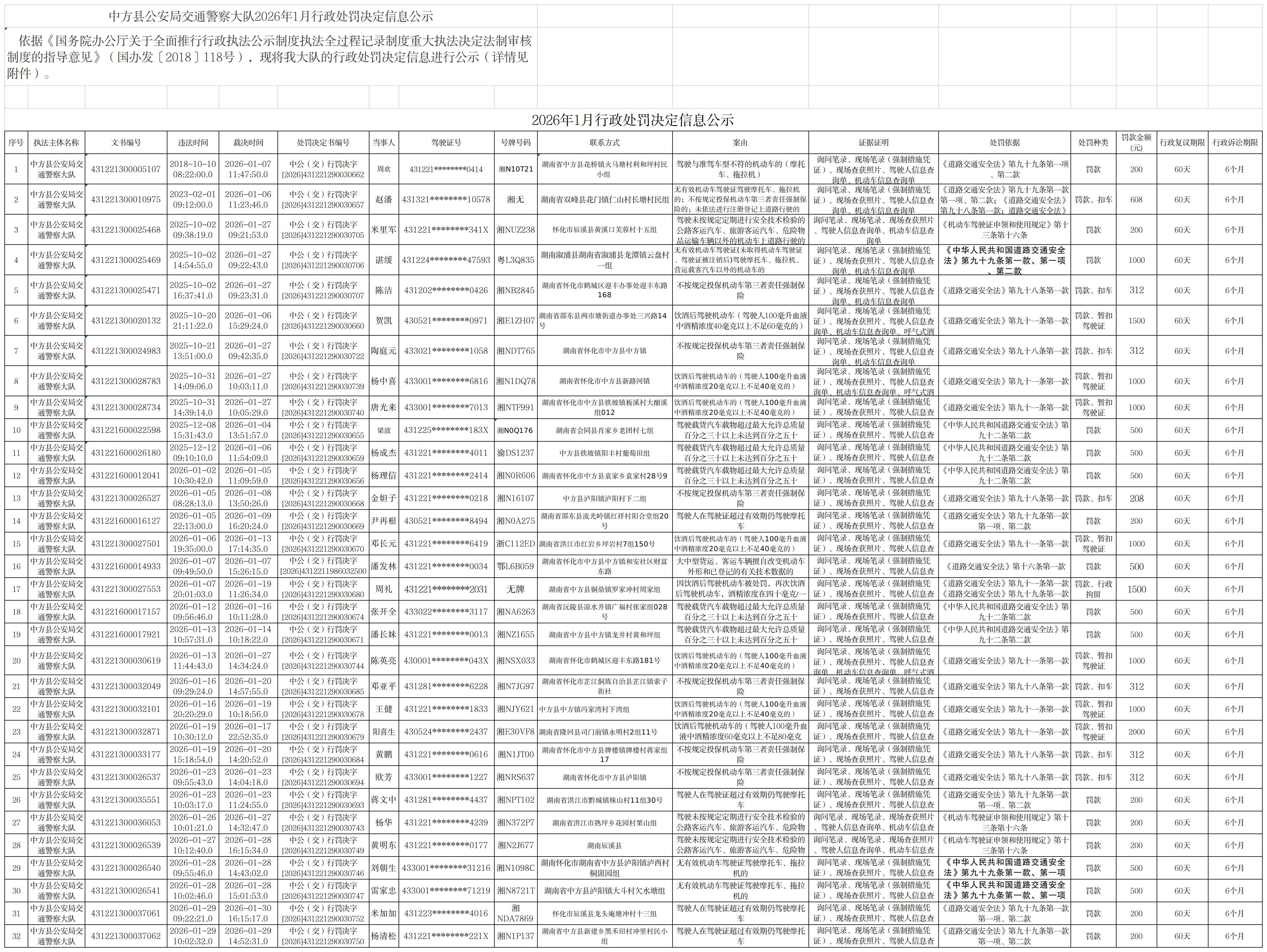 中方县公安局交通警察大队2026年1月行政处罚决定信息公示