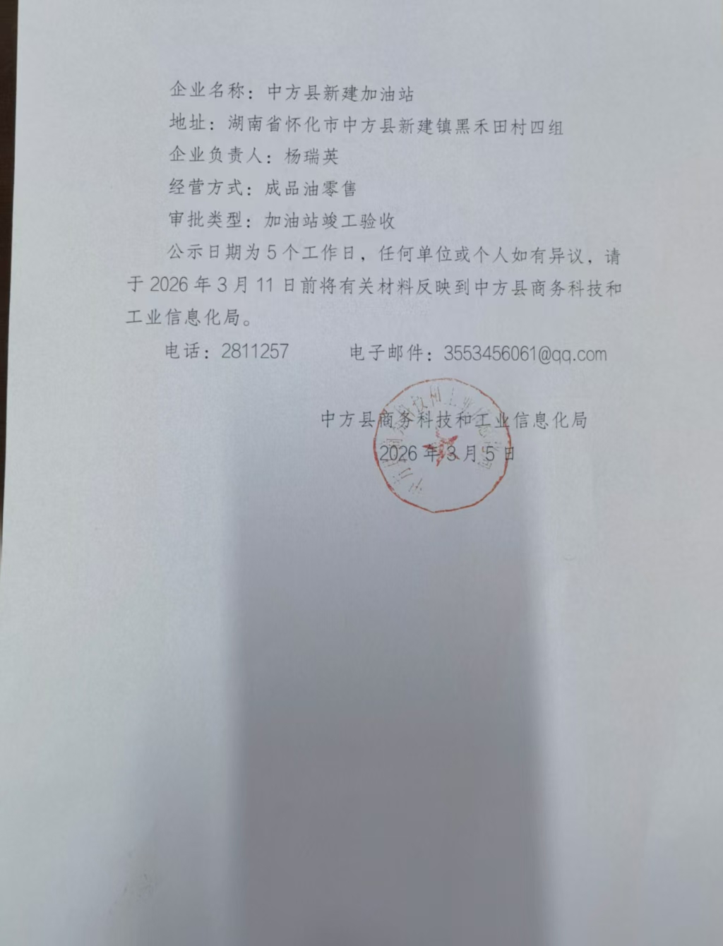 中方县商务科技和工业信息化局关于对中方县中海油料有限公司桐运加油站、中方县新建加油站申请加油站竣工验收事项的许可公示
