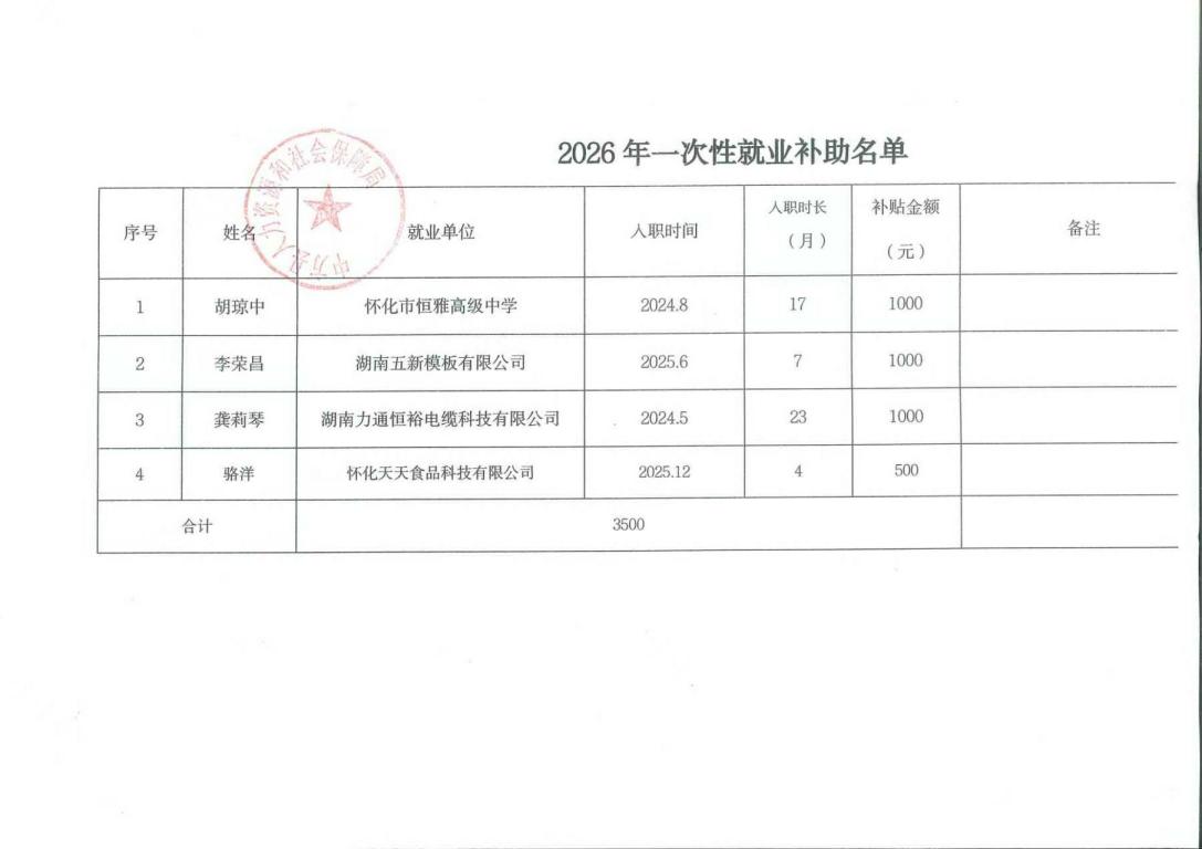 中方县2026年一次性就业补助(第一批)公示