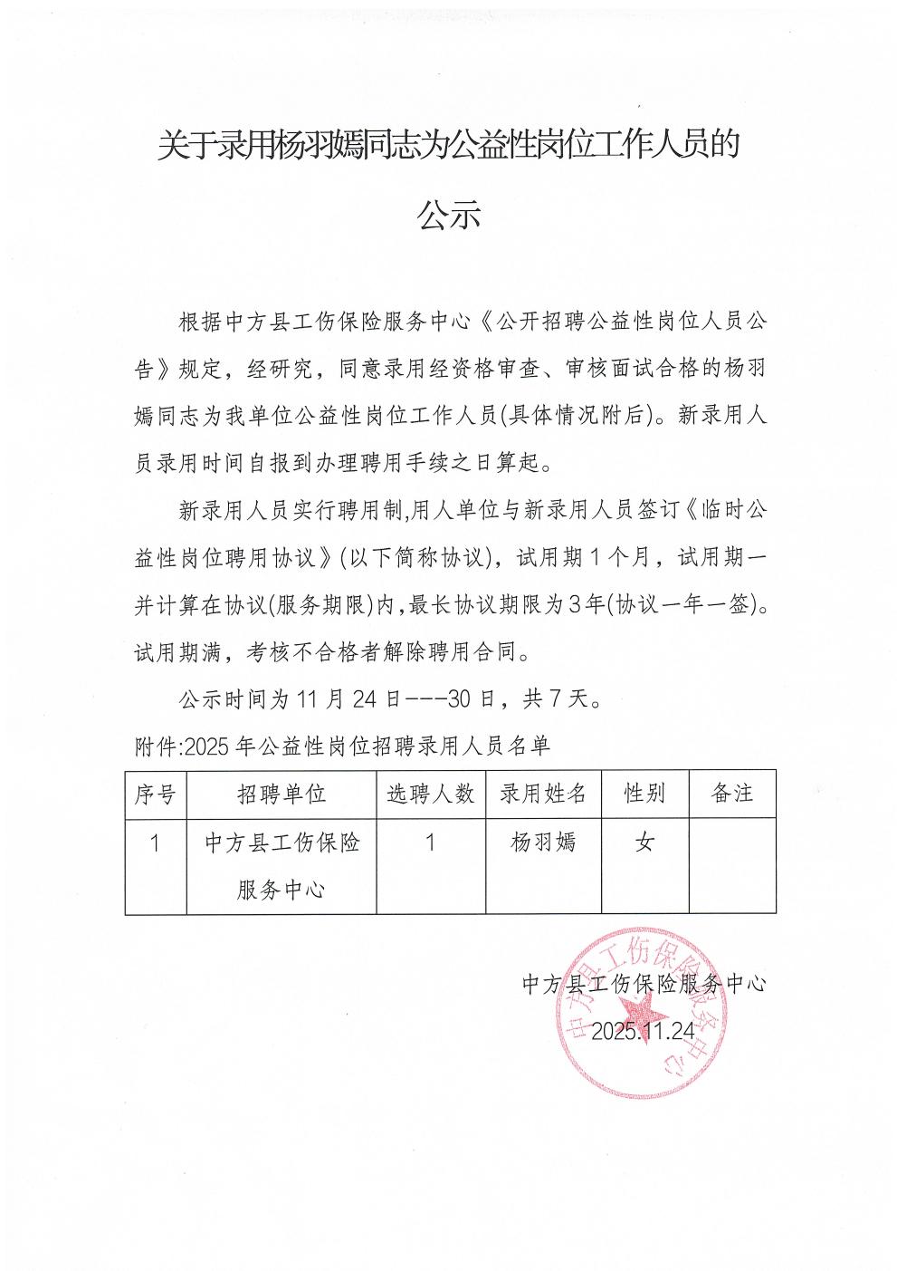 关于录用杨羽嫣同志为公益性岗位工作人员的公示