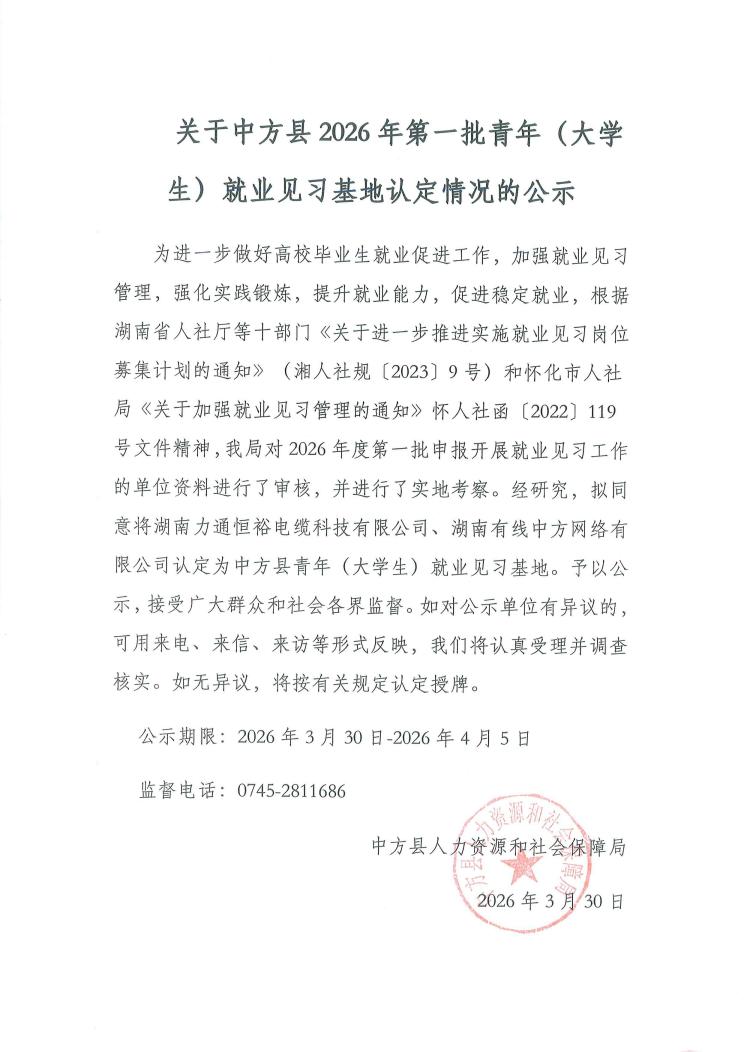 关于中方县2026年第一批青年(大学生)就业见习基地认定情况的公示
