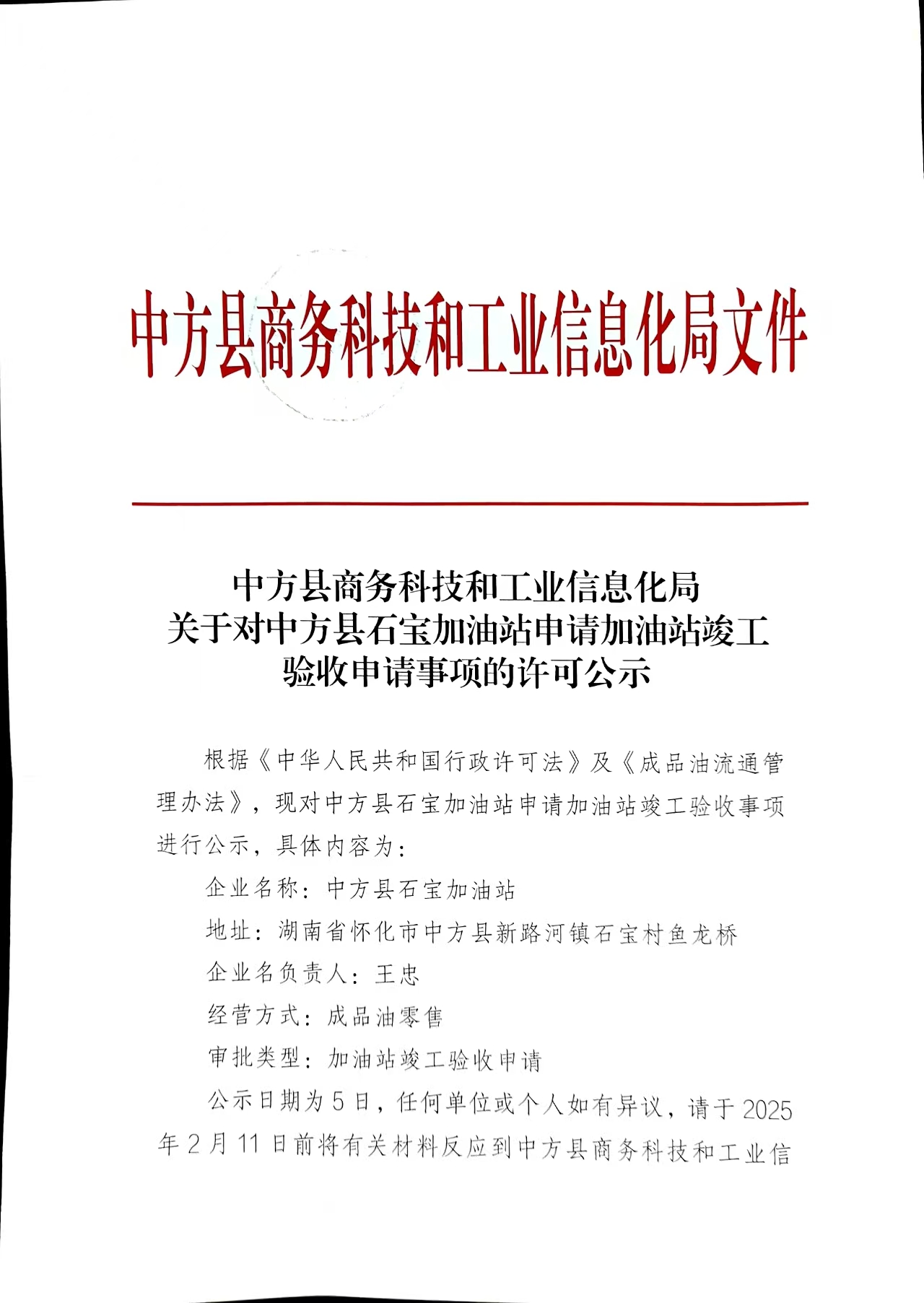 中方县商务科技和工业信息化局关于对中方县石宝加油站申请加油站竣工验收申请事项的许可公示