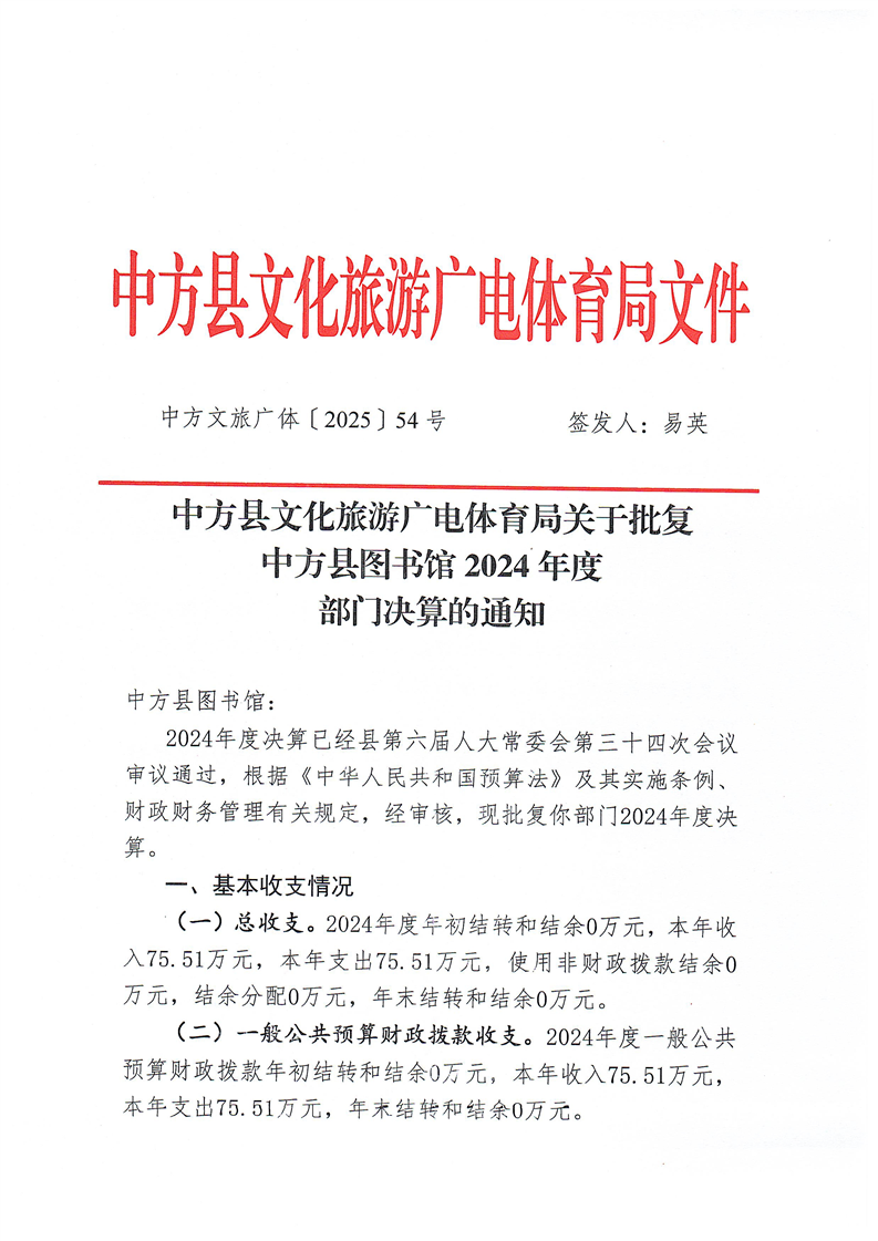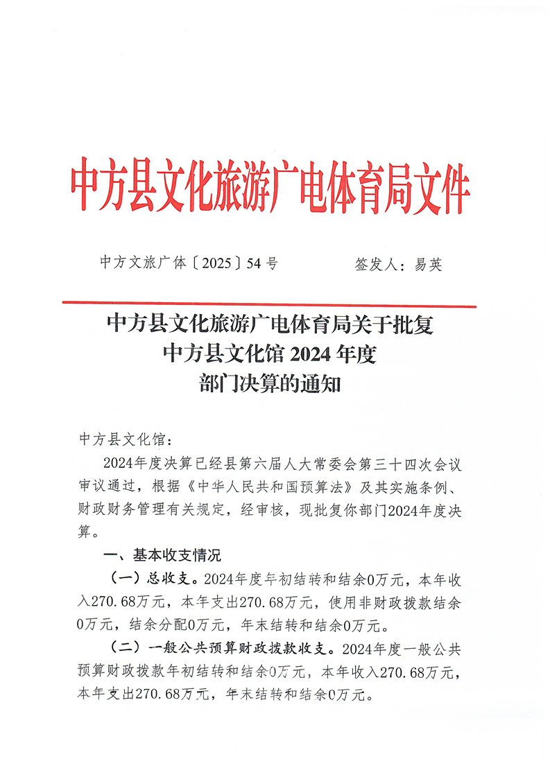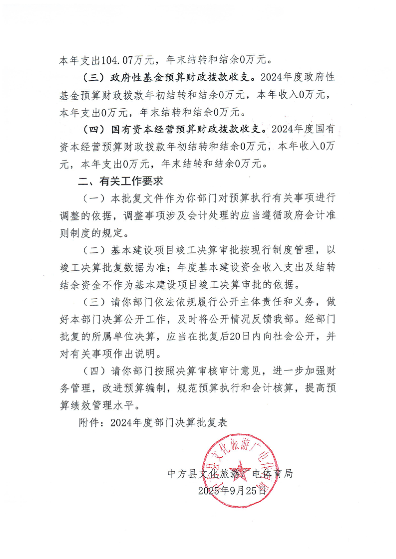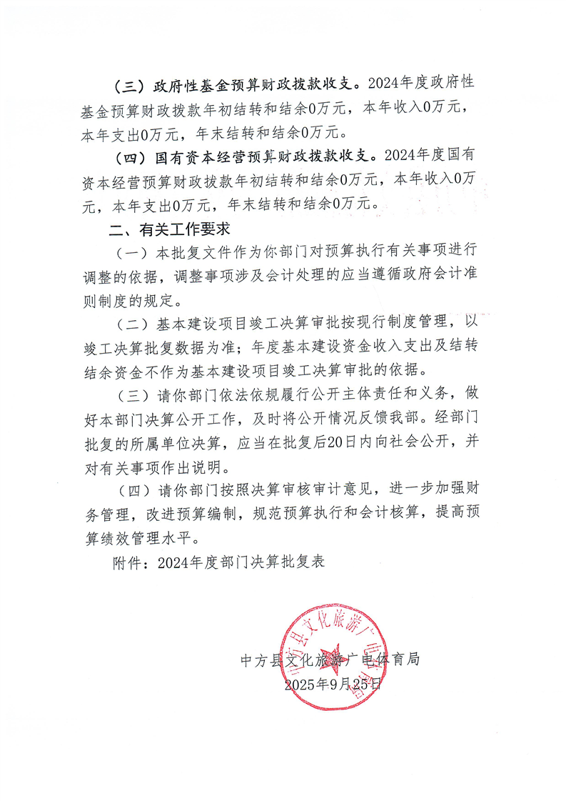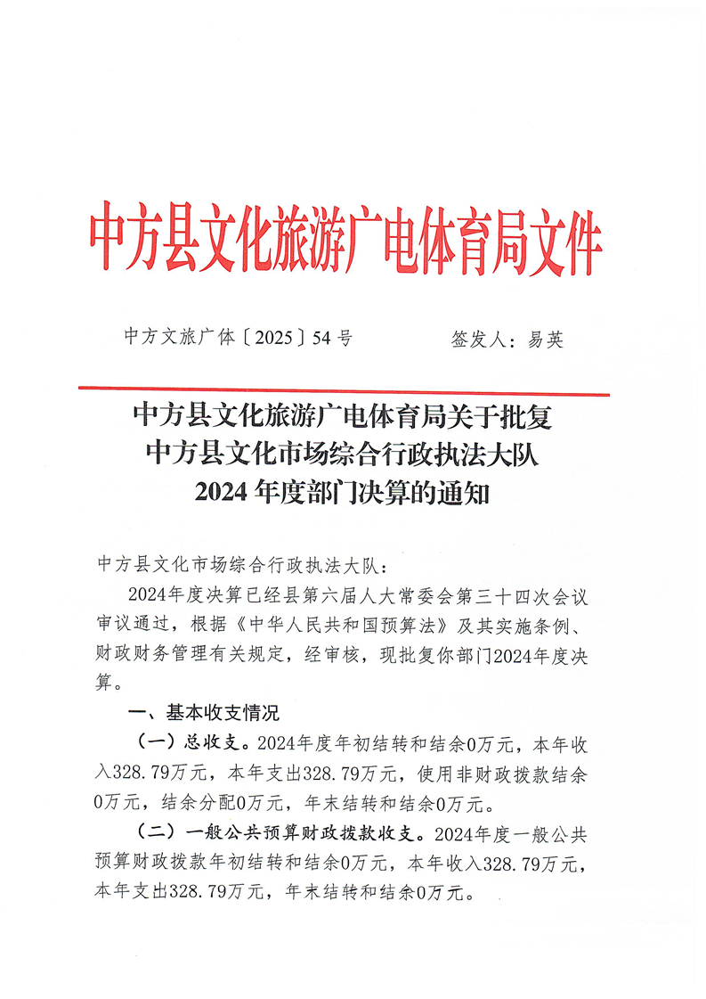 中方县文化旅游广电体育局关于批复局属二级机构2024部门决算的通知