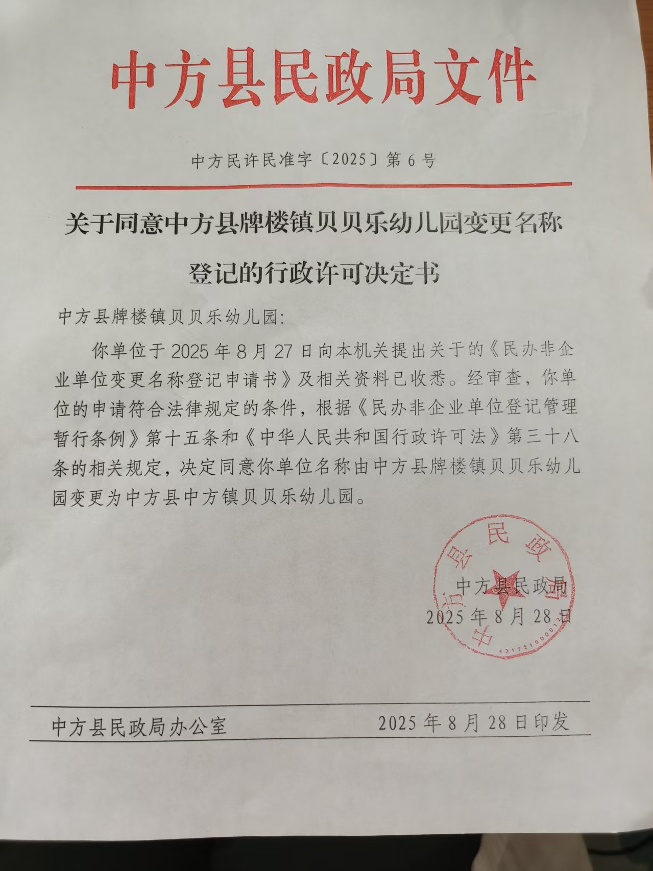 关于同意中方县牌楼镇贝贝乐幼儿园变更名称等级的行政许可决定书