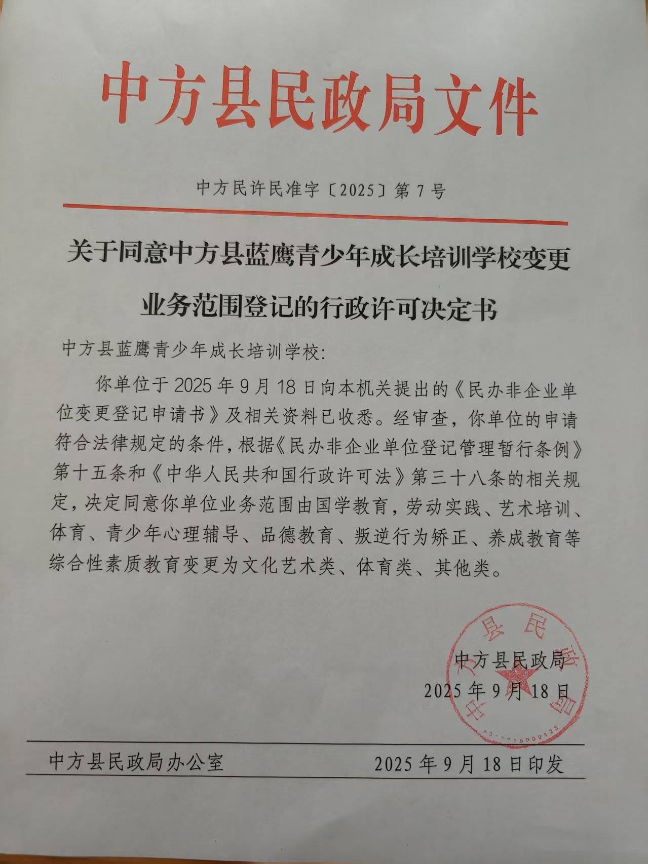 关于同意中方县蓝鹰青少年成长培训学校变更业务范围登记的行政许可决定书