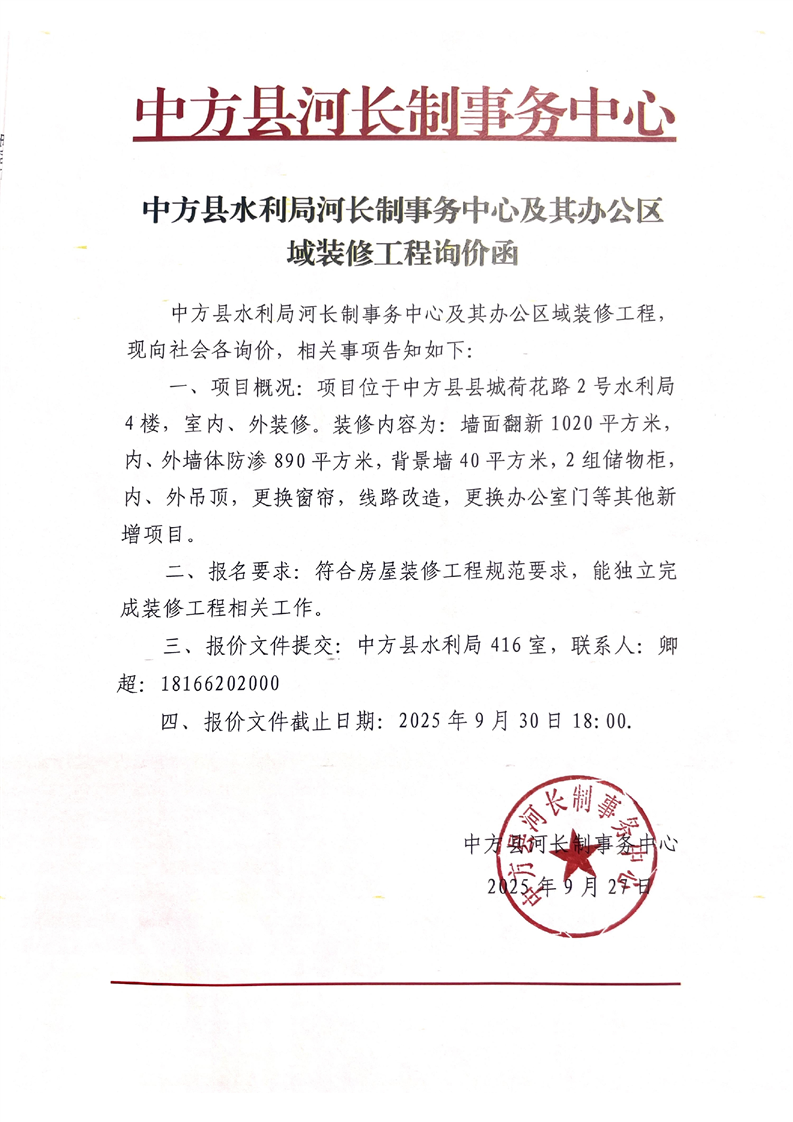 中方县水利局河长制事务中心及其办公区域装修工程询价函