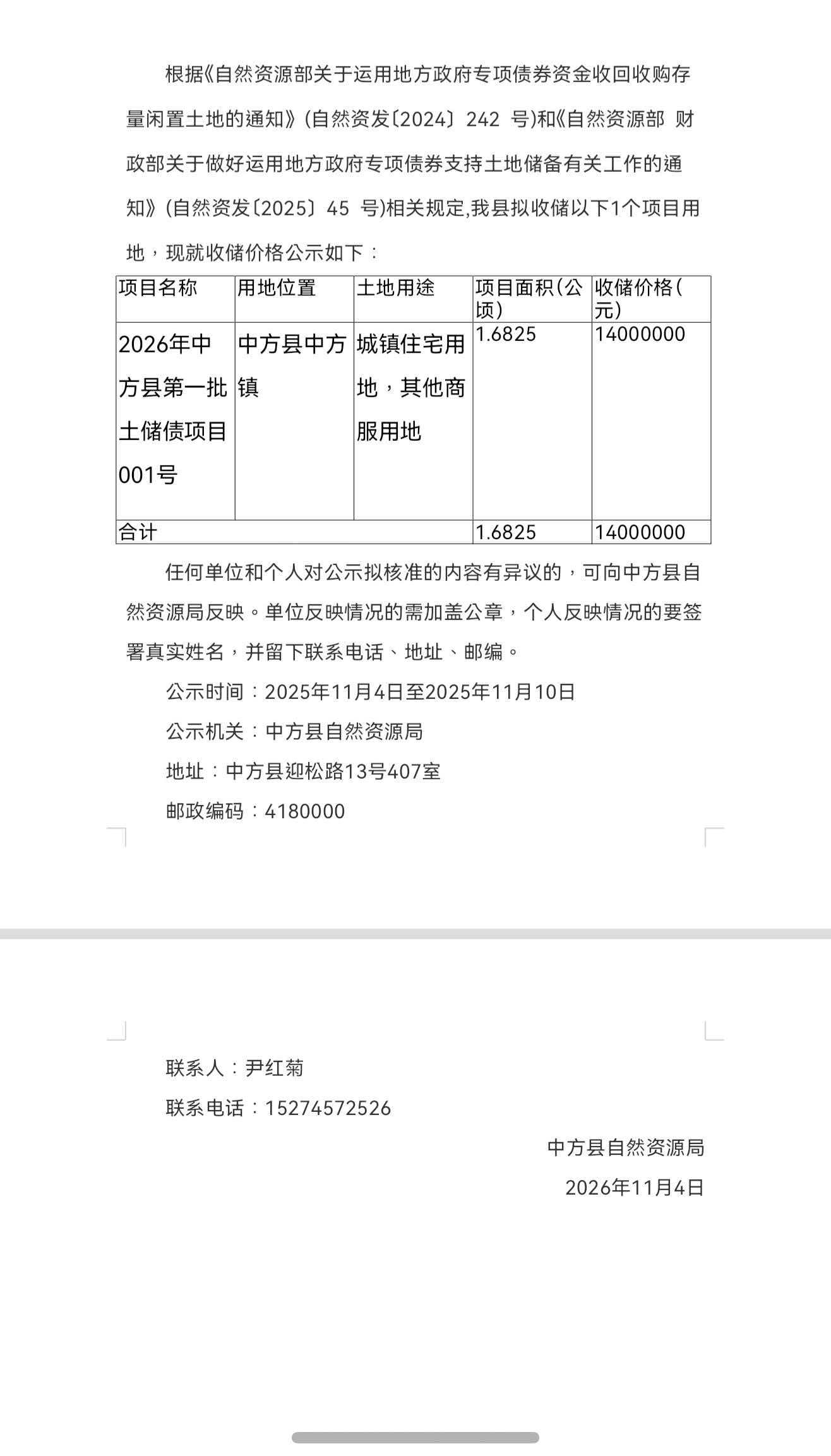 中方县自然资源局关于中方县2026年第一批土地储备专项债券项目地块收储价格的公示