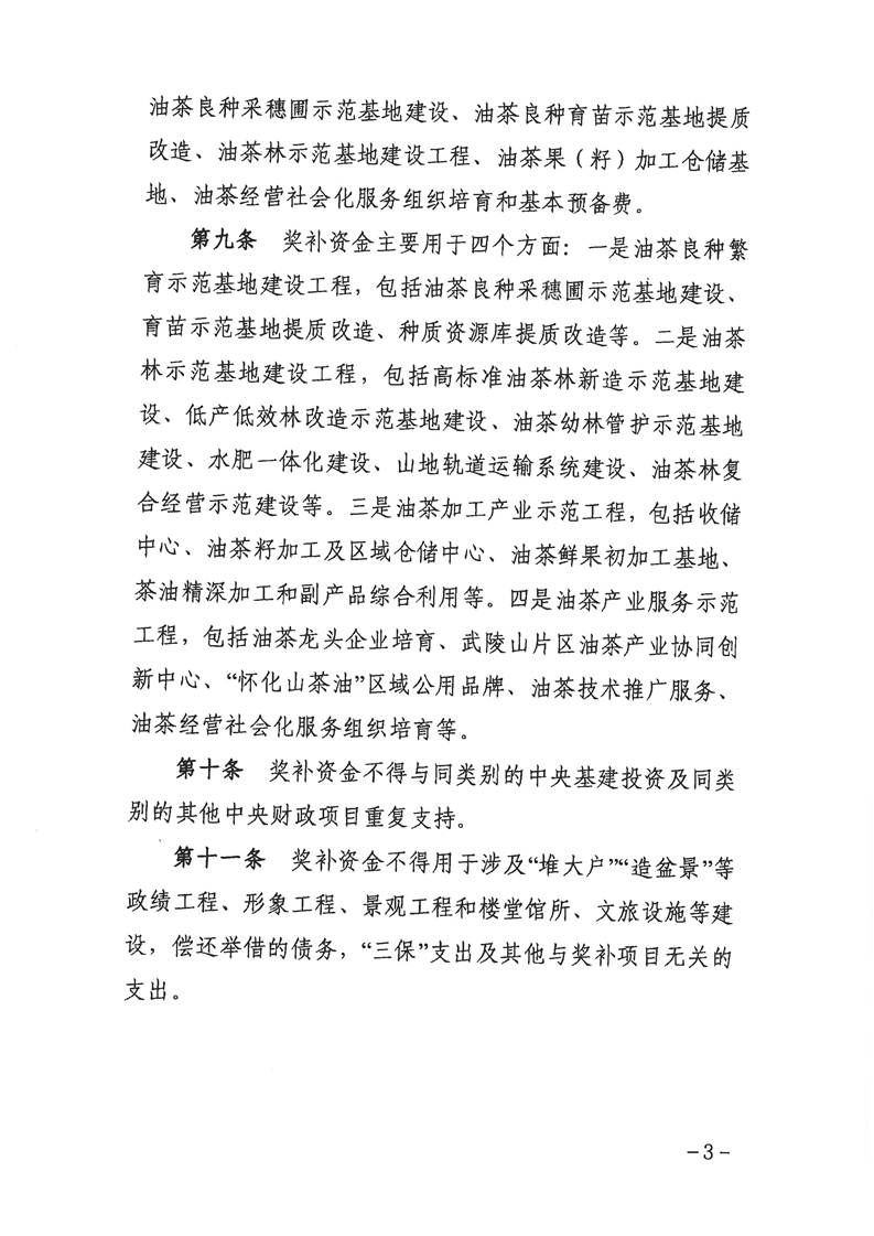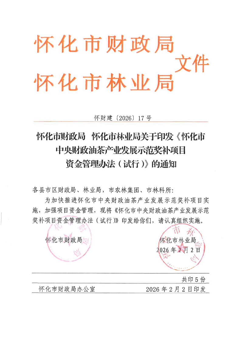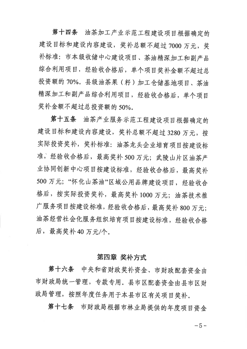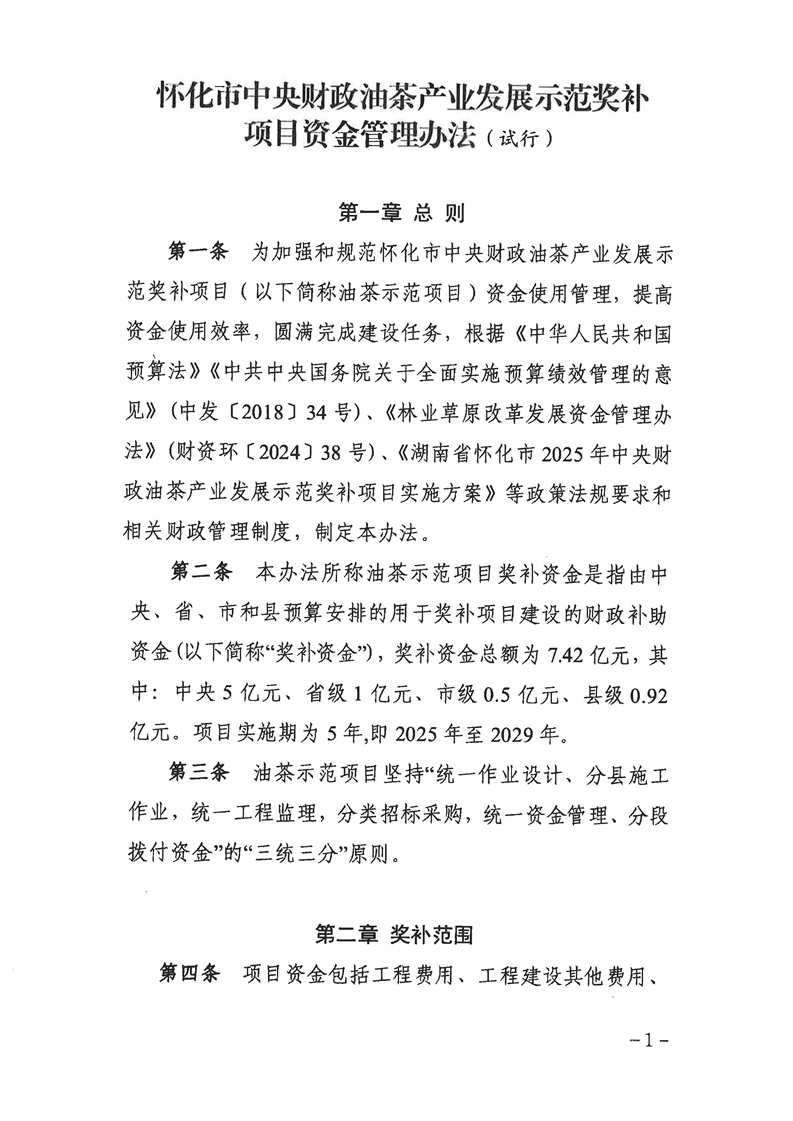怀化市中央财政油茶产业发展示范奖补项目资金管理办法(式行)的通知