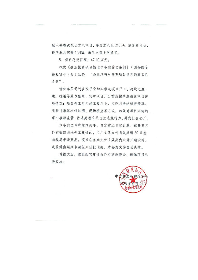 中方县大雄新能源科技有限公司中方县杨绍华等4户105KW户用非自然人分布式光伏发电项目备案
