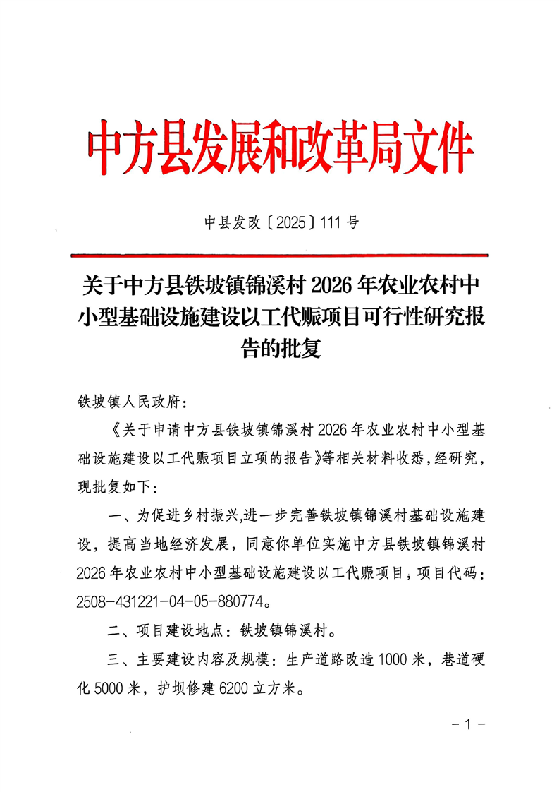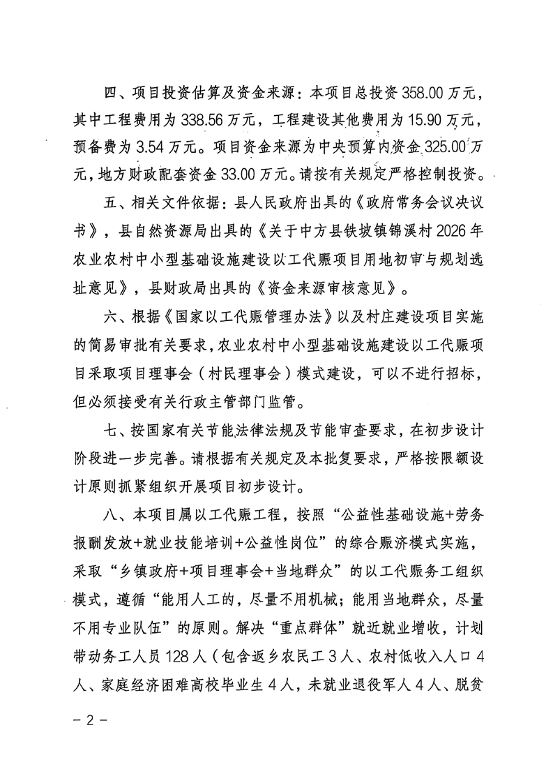 关于中方县铁坡镇锦溪村2026年农业农村中小型基础设施建设以工代赈项目可行性研究报告的批复