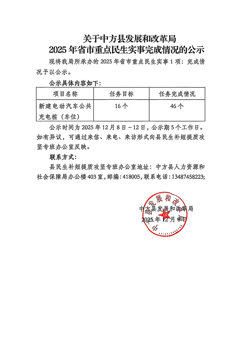 关于中方县发展和改革局2025年省市重点民生实事完成情况的公示