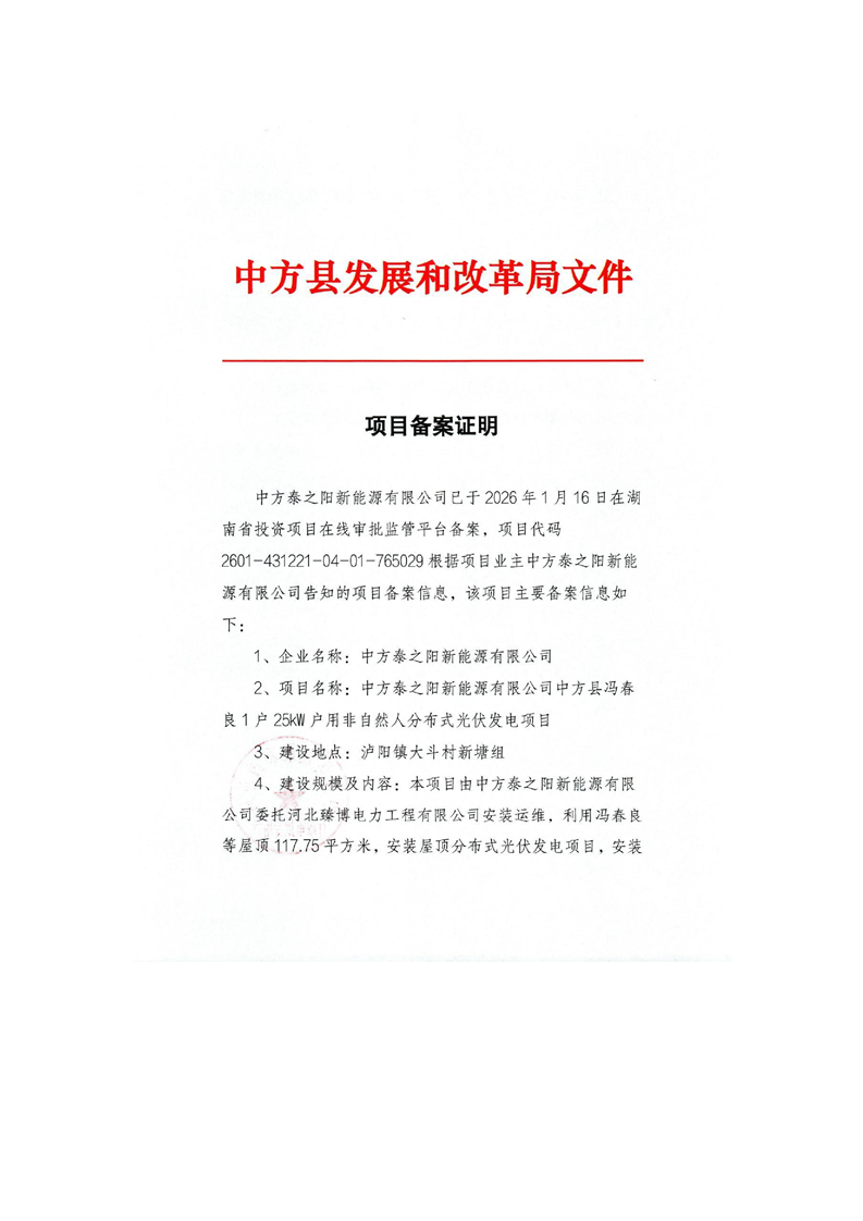 中方泰之阳新能源有限公司中方县冯春良1户25kW户用非自然人分布式光伏发电项目备案