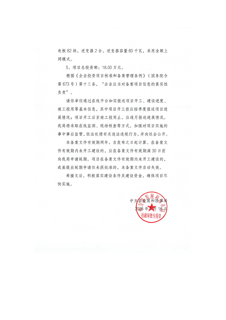 中方泰之阳新能源有限公司中方县陈青等2户60kW户用非自然人分布式光伏发电项目备案
