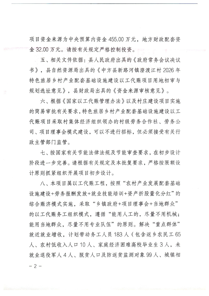关于中方县新路河镇澄渡江村2026年特色旅居乡村产业配套基础设施建设以工代赈项目可行性研究报告的批复