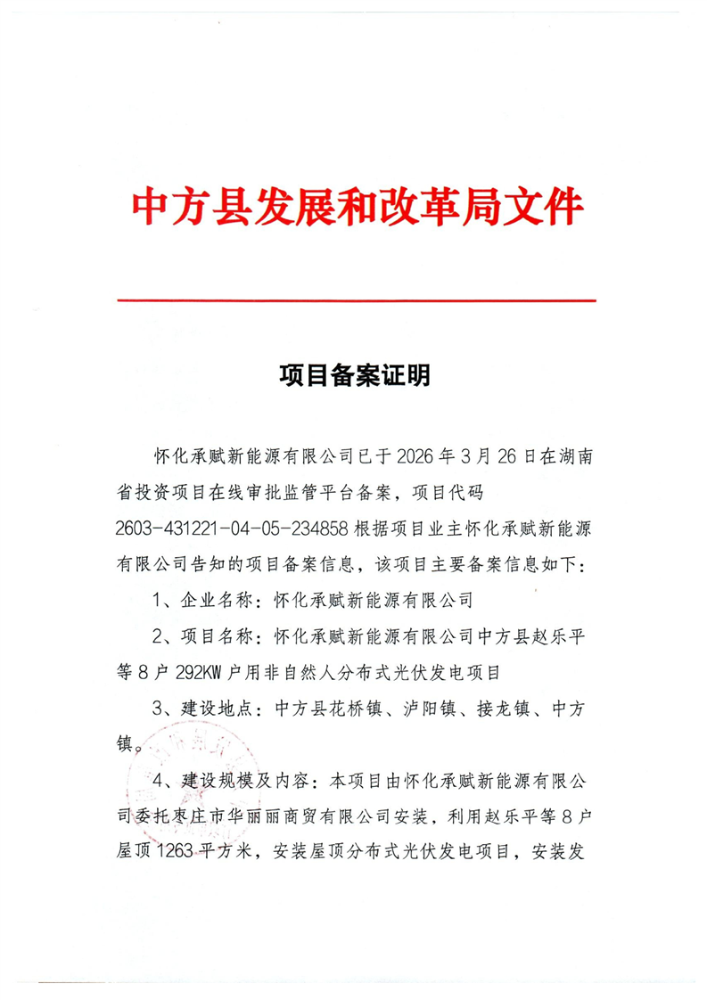 怀化承赋新能源有限公司中方县赵乐平等8户292KW户用非自然人分布式光伏发电项目备案证明