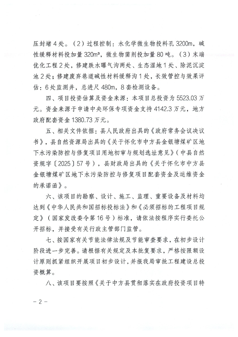 关于怀化市中方县金银塘煤矿区地下水污染防控与修复项目可行性研究报告的批复
