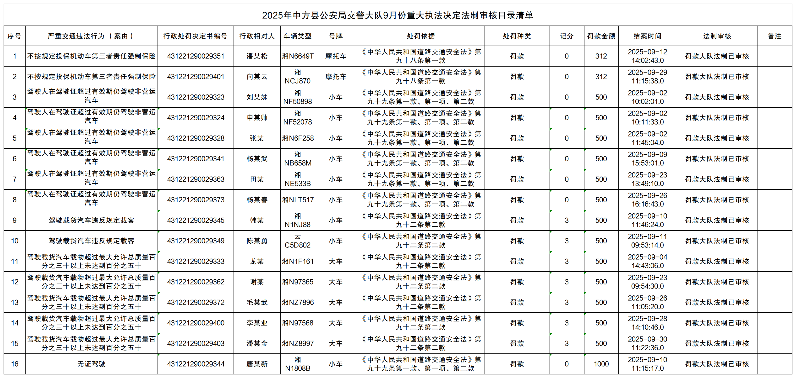 2025年中方县公安局交管大队9月份重大执法决定法制审核目录清单