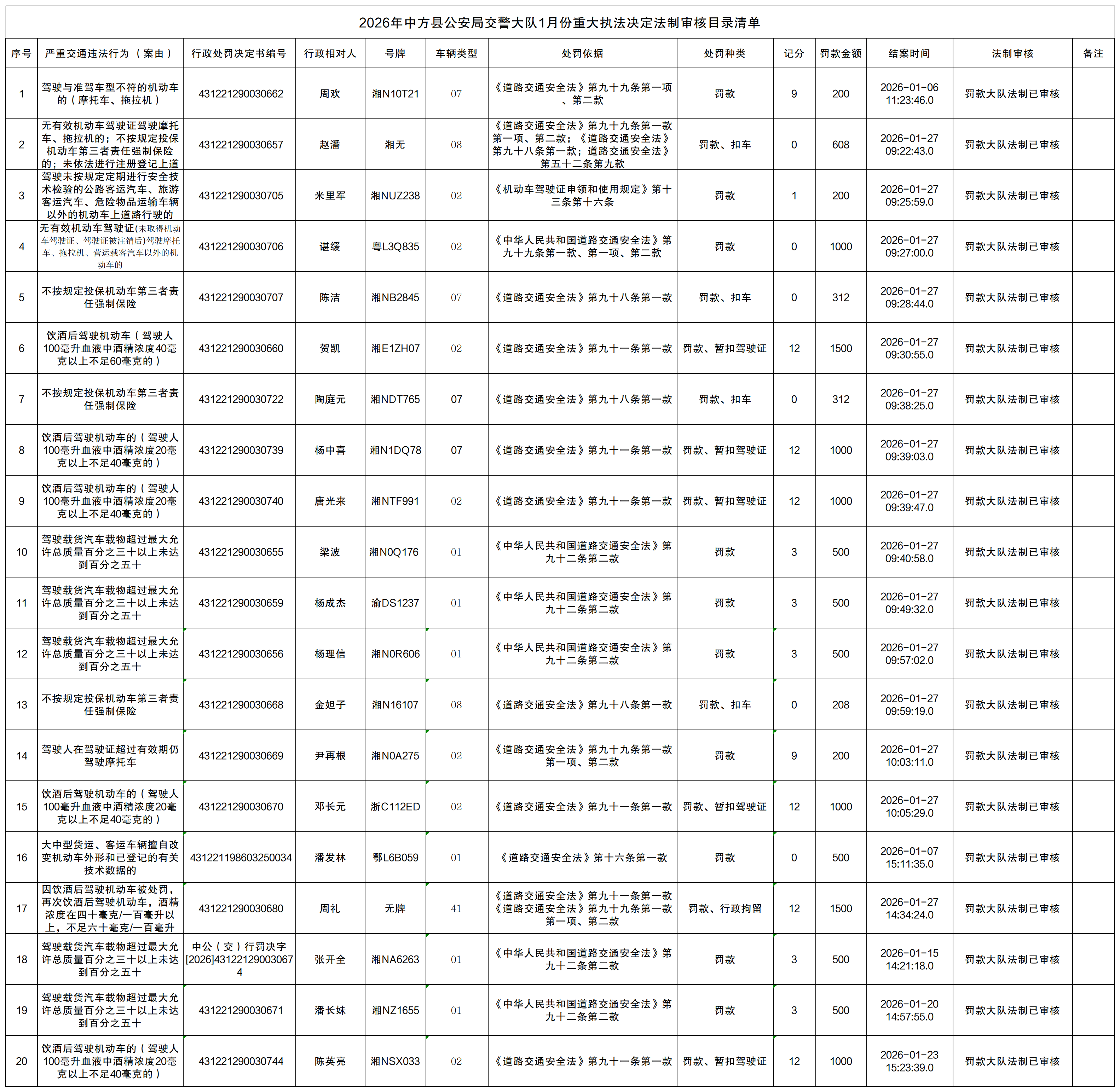 2026年中方县公安局交警大队1月份重大执法决定法制审核目录清单