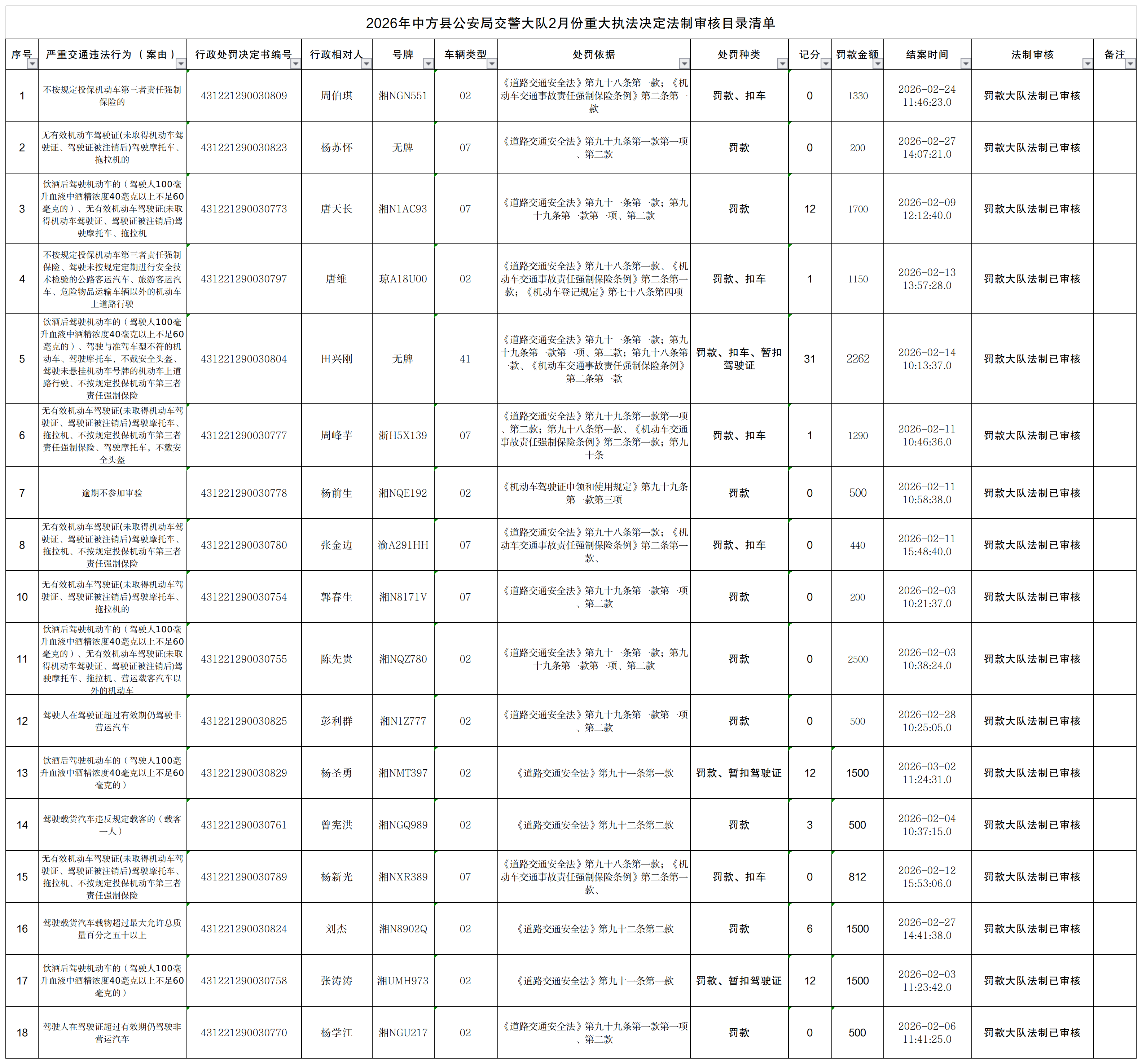 中方县公安局交警大队2026年2月份重大执法决定法制审核目录清单