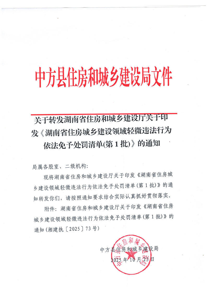 关于转发湖南省住房和城乡建设厅关于印发《湖南省住房城乡建设领域轻微违法行为依法免予处罚清单(第1批)》的通知