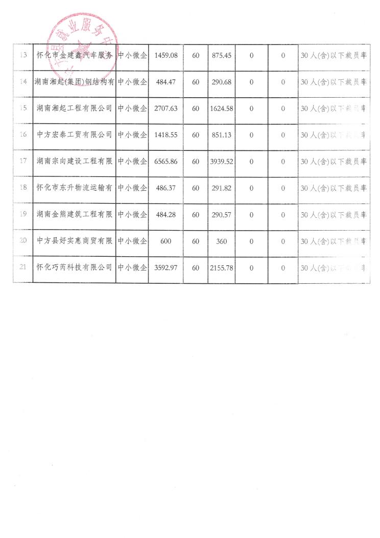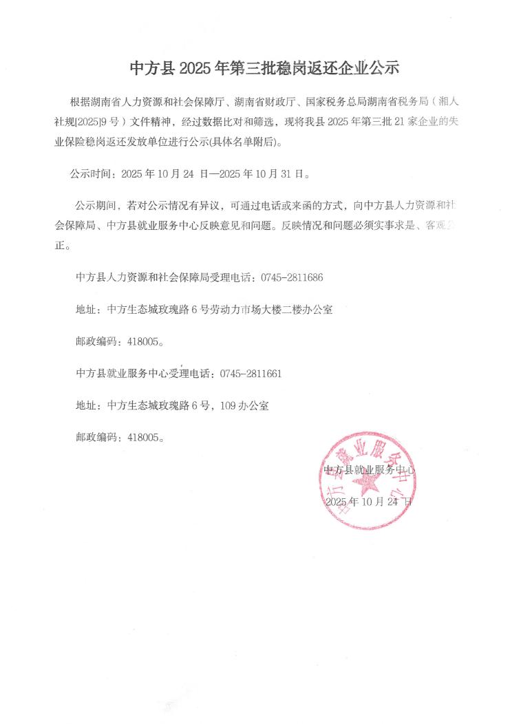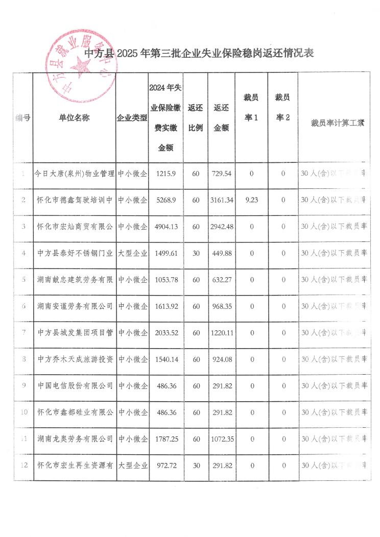 中方县2025年第三批稳岗返还企业公示