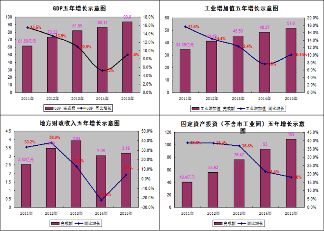 1.经济实力显著增强。地区生产总值(GDP)年均增长10.8%,2015年达到93.8亿元(预计数,以下同),人均GDP达到5862美元,2014年全面小康实现水平进入全省前十位,2015年全面小康实现程度达到91.6%。五年全社会固定资产投资(不含市工业园)累计完成375亿元,年均增长30.4%,其中2015年完成109亿元。工业增加值年均增长12.37%,其中县内规模工业增加值年均增长14.8%。一般公共预算收入年均增长13.7%,2015年达到5.31亿元,其中地方财政收入年均增长10.9%,2015年达到3.19亿元。全社会消费品零售总额年均增长14.2%,2015年达到15.15亿元。