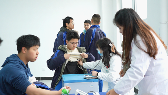 体检现场,学生们在老师的引导下,身着校服有序列队,依次前往各个检查区域。医院针对高考体检需求,精心划分了内科、外科、视力、听力、血压、血常规、胸透等专项检查区域,各环节衔接顺畅。医护人员严格遵循高考体检标准,细致完成各项检查操作,认真记录每一项数据,同时耐心解答考生关于健康状况的疑问,以严谨细致的态度和温和贴心的服务,缓解了考生的紧张情绪。