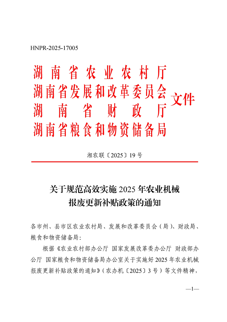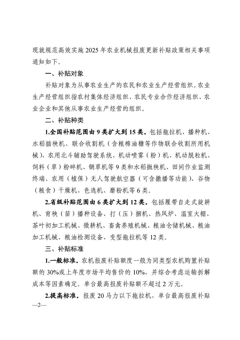 关于规范高效实施2025年农业机械报废更新补贴政策的通知