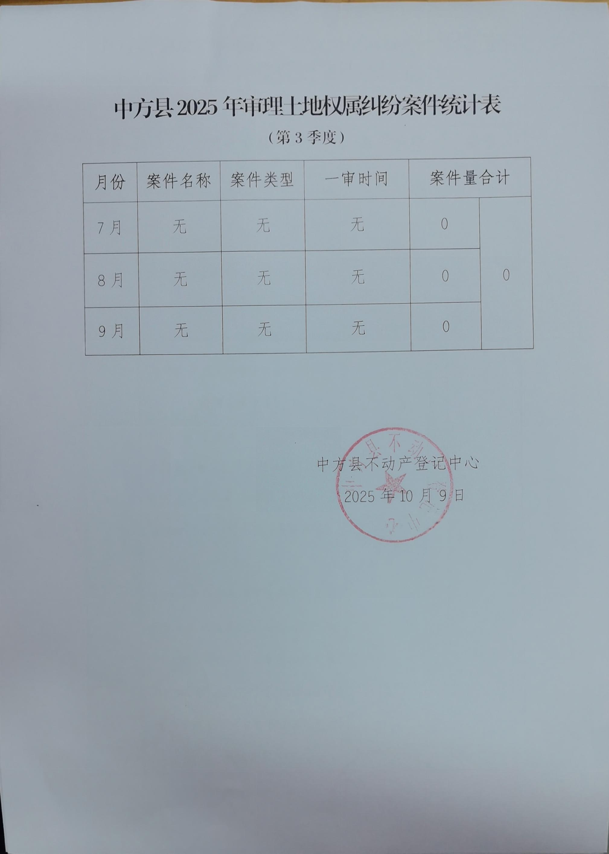 中方县2025年审理土地权属纠纷案件统计表(第三季度)