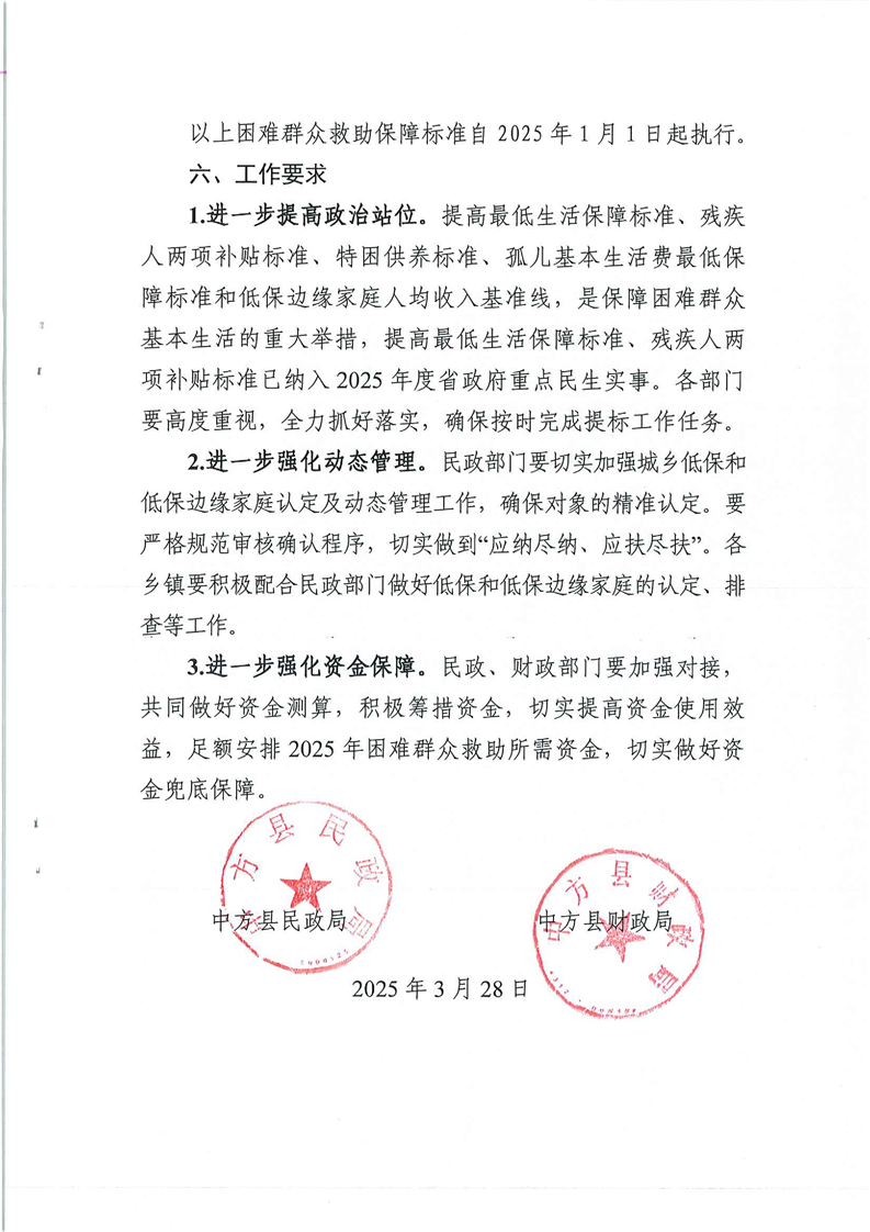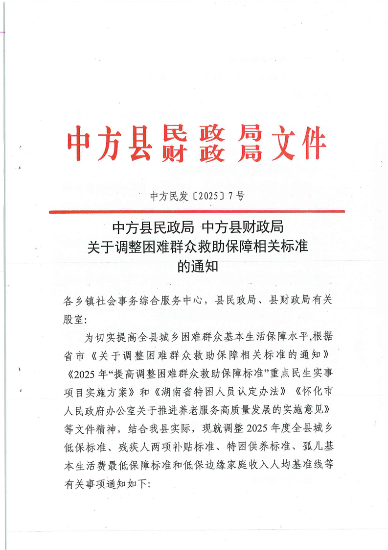 中方县民政局中方县财政局关于调整困难群众救助保障相关标准的通知