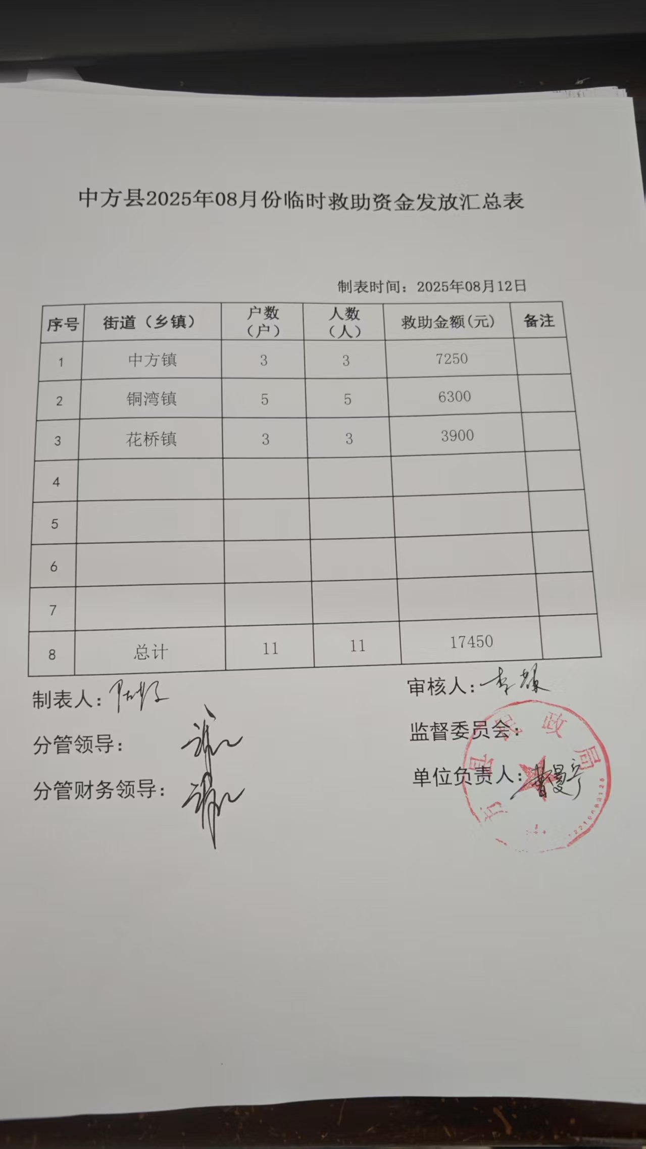 中方县2025年8月临时救助公示表
