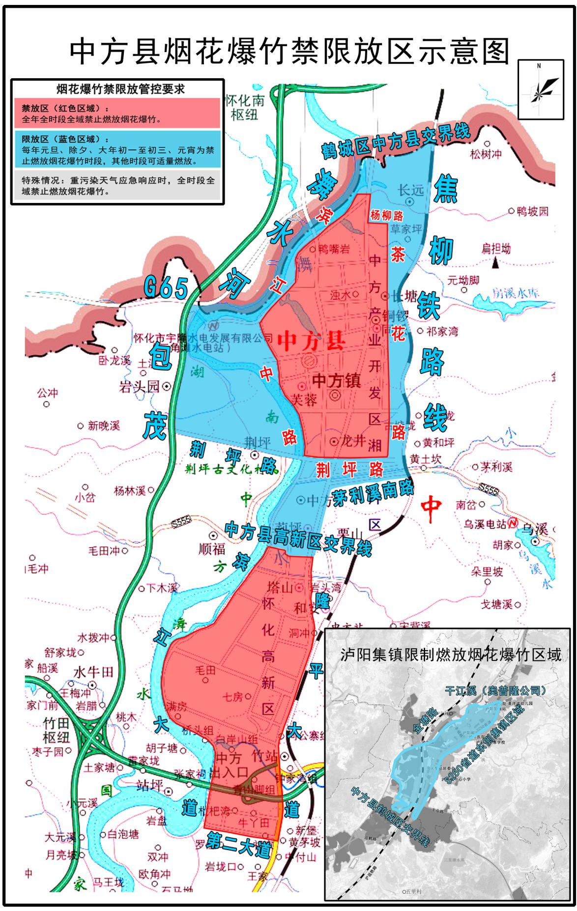 1、县城限制燃放烟花爆竹区域为:北至鹤城区中方县交界线(舞水风暴处),东至焦柳铁路,南至毛利溪南路、隆平大道、城南路、希望路、滨江南路、荆坪西路两侧建成区边界线,西至包茂高速合围区。