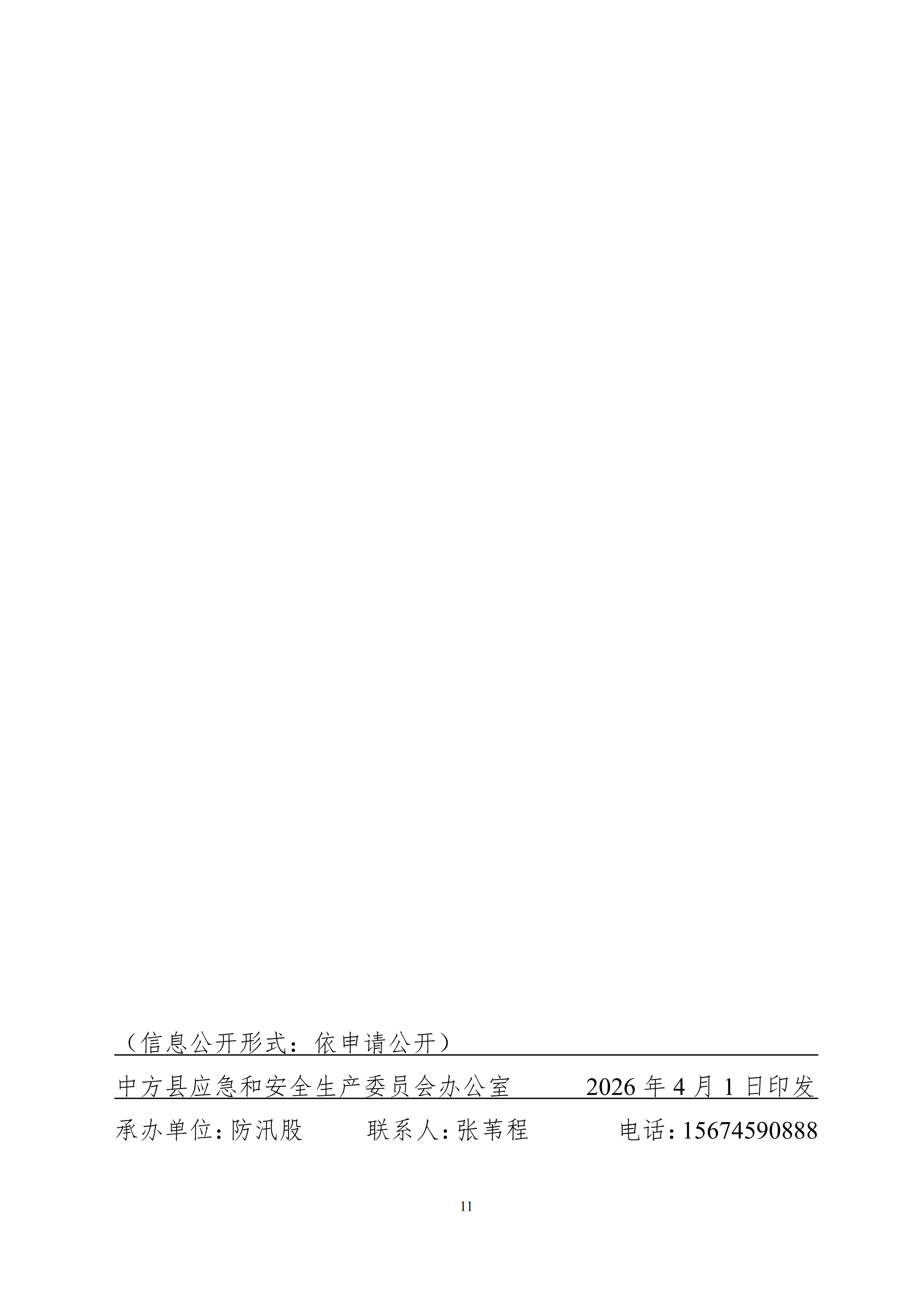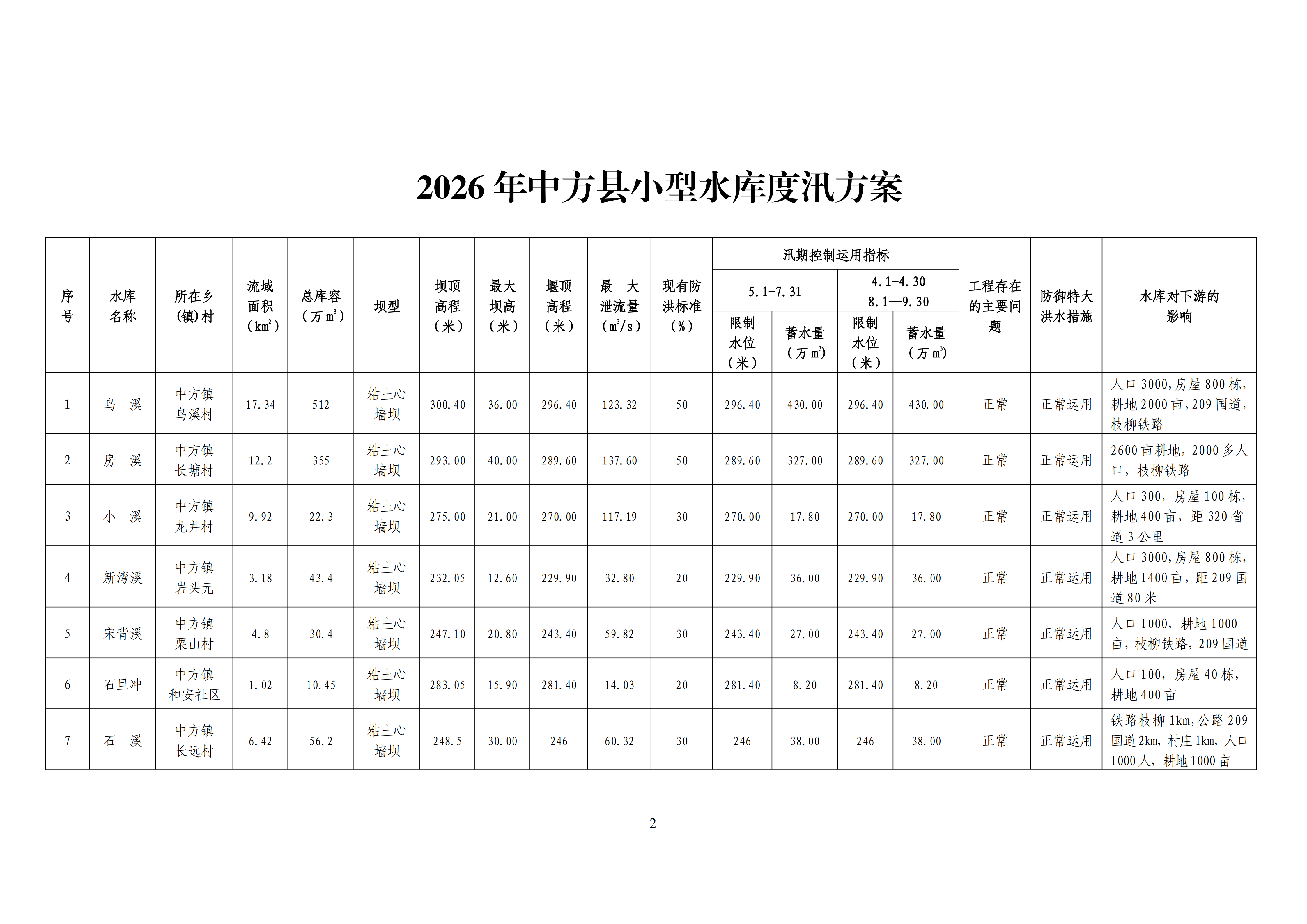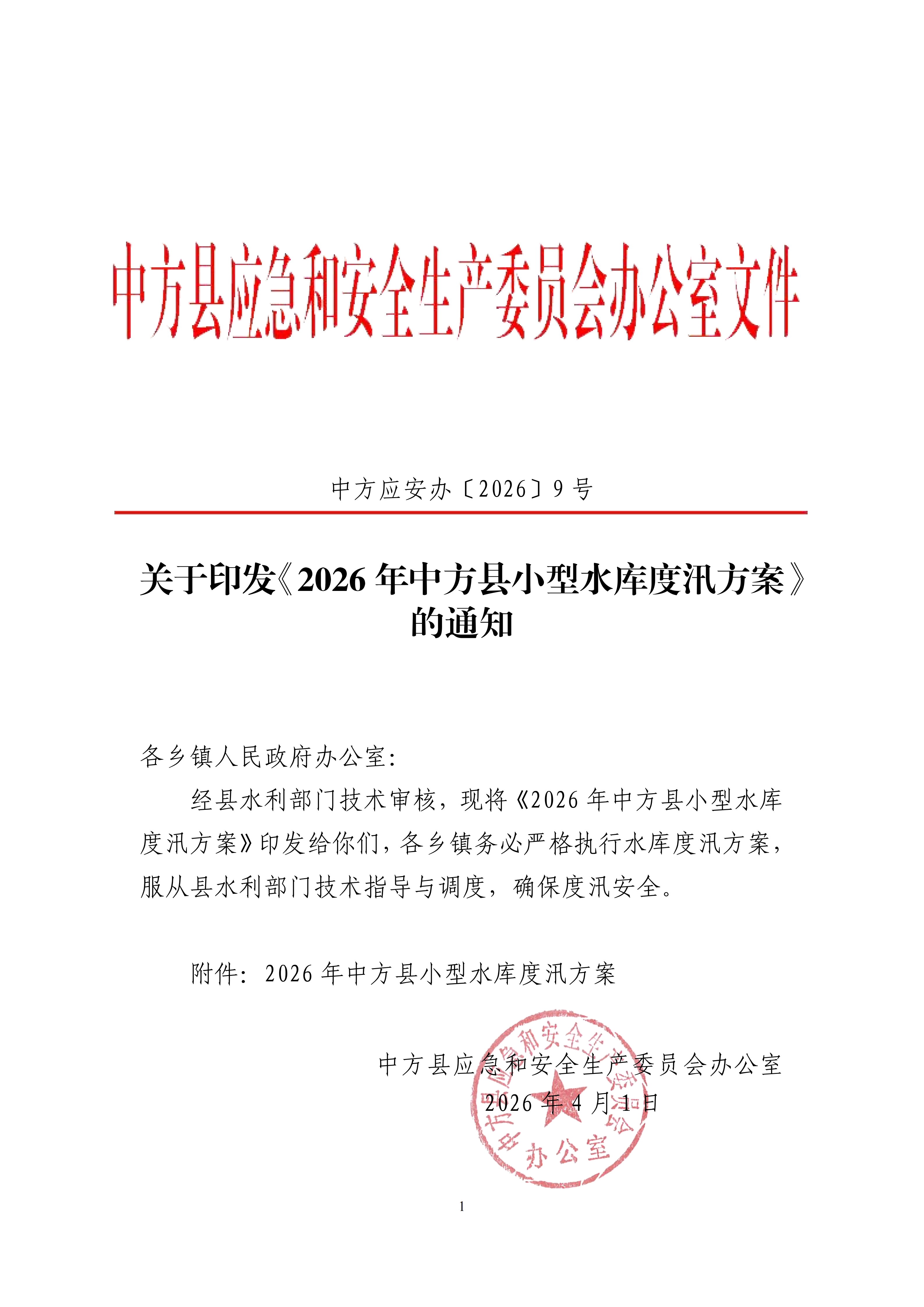 关于印发《2026年中方县小型水库度汛方案》的通知