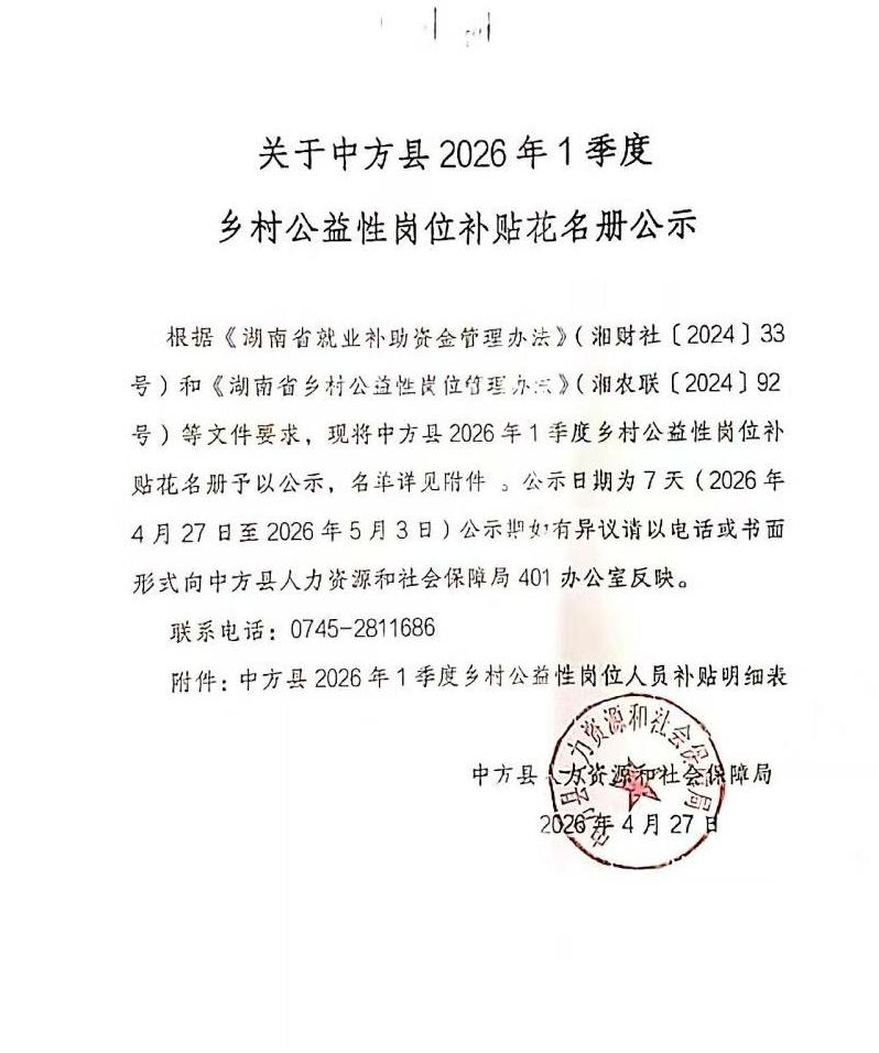 关于中方县2026年1季度乡村公益性岗位补贴花名册公示