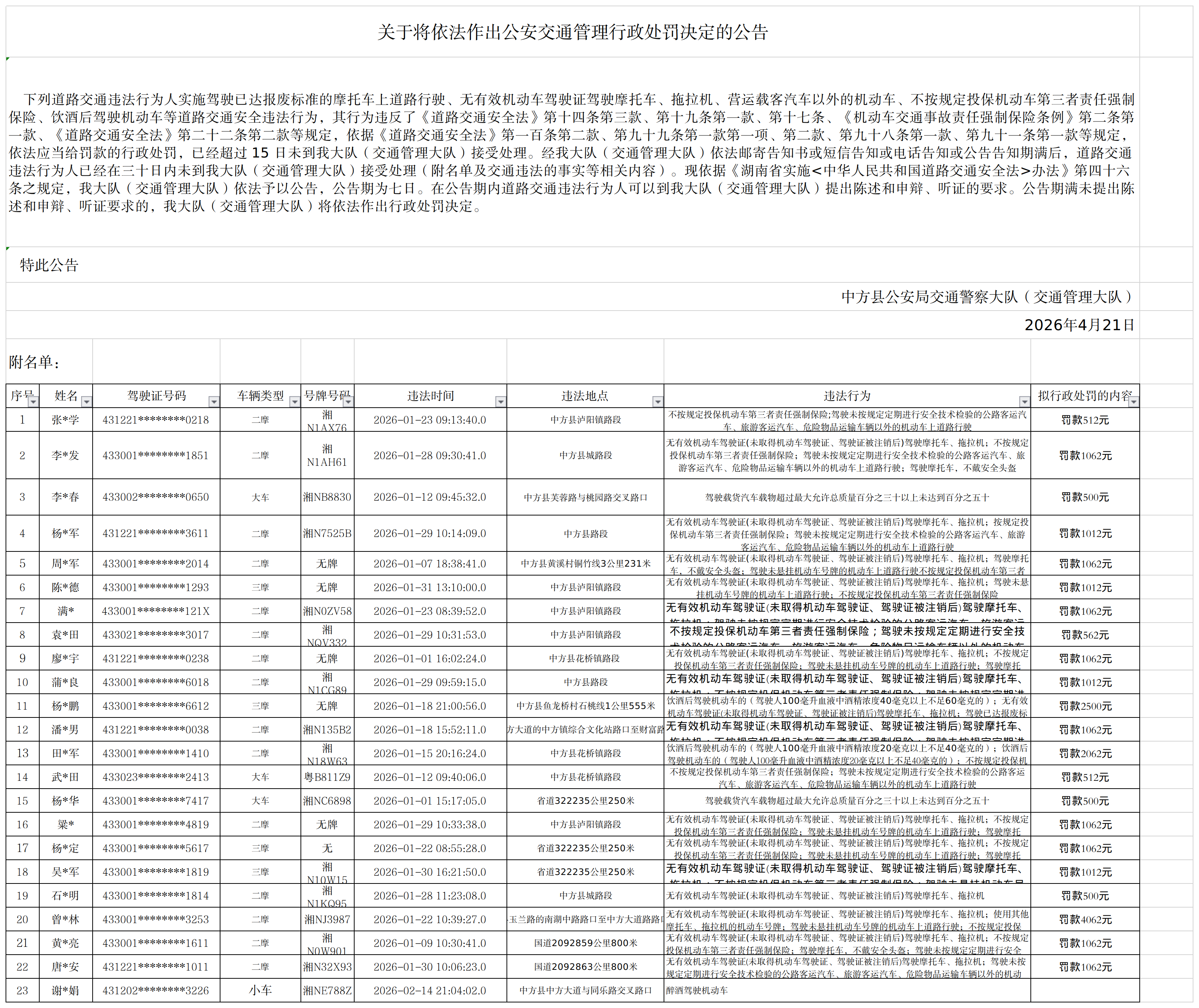 关于将依法作出公安交通管理行政处罚决定的公告
