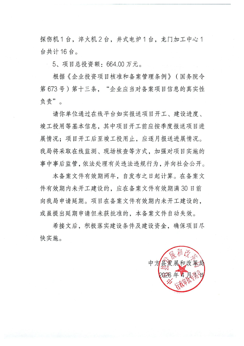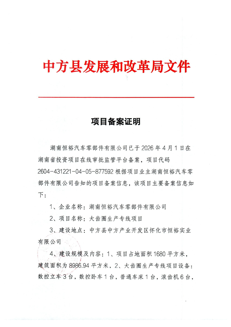湖南恒裕汽车零部件有限公司大齿圈生产专线项目备案证明