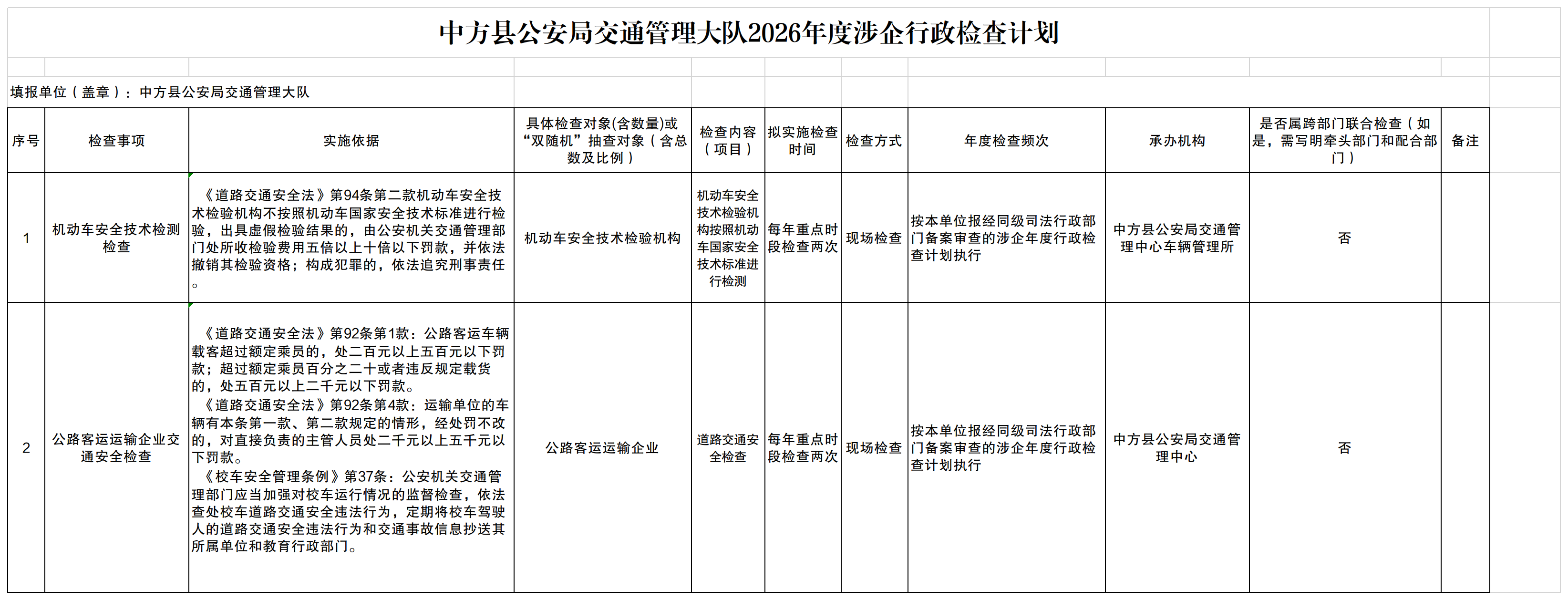 中方县公安局交通管理大队2026年度涉企行政检查计划